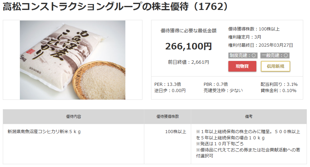 1年継続保有がついてしまったが、今まで食べた中で一番美味しいお米どこかで売ってたら買いたいくらいなんだが、なので優待続く限りガチホ株価軟調で今の2,700円割れは優待狙いには悪くないタイミング