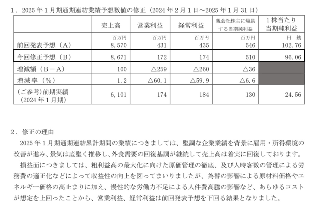 修正理由が、為替の影響による原材料価格やエネルギー価格の高止まりに加え、慢性的な労働力不足による人件費高騰の影響など、あらゆるコストが想定を上回ったことから、営業利益、経常利益は前回発表予想を下回る結果となりましただけど、これから同じような状況出てくる外食ありそうなので注意、利益水準が低いところは要警戒かな実家口座で優待枠保有していたけど寄りで売り、安く買えてたので利確で終われて良かった