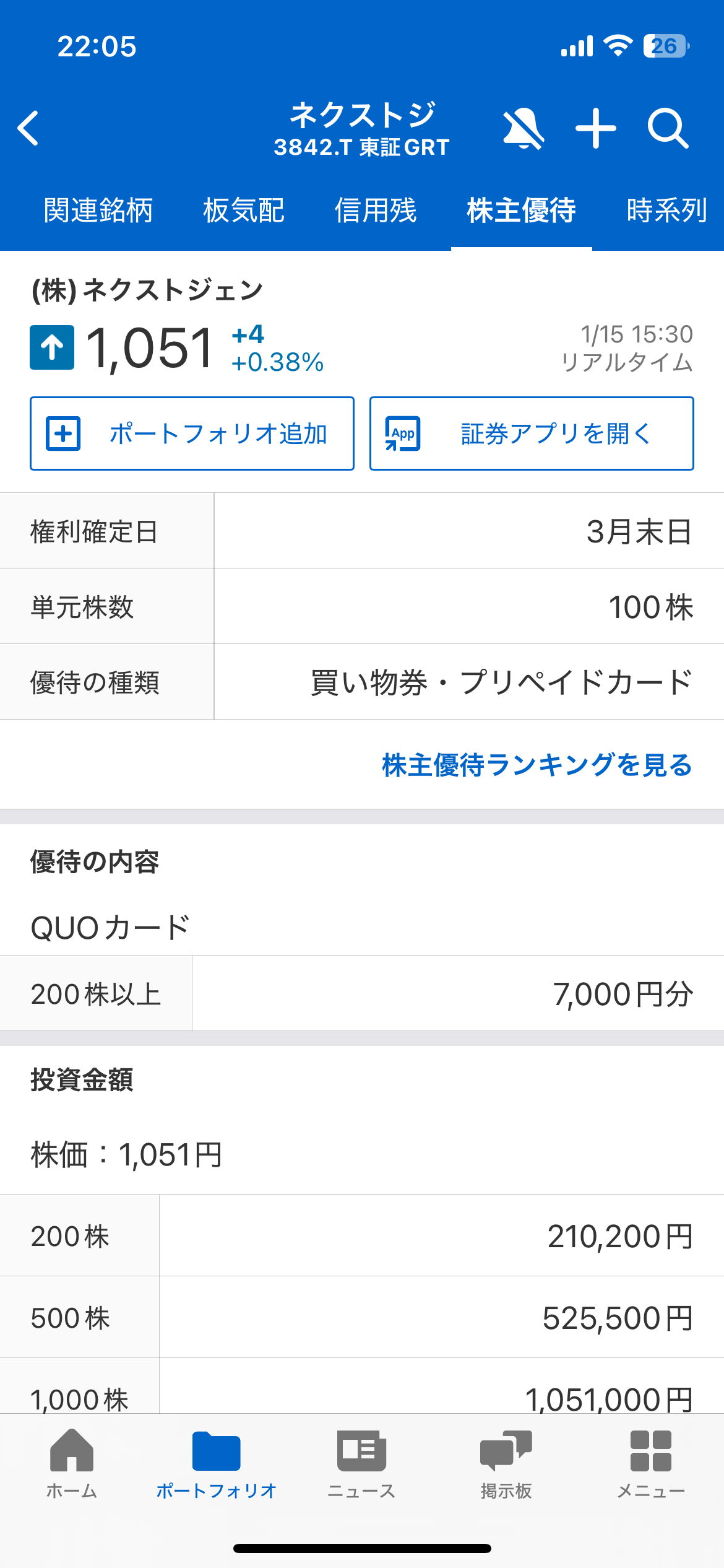 200株保有で配当の税金2割引いて8円として1,600円とクオカード7,000円で8,600円になる優待配当利回り4%越えで桐谷さん基準クリアしてる