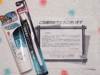 ツルハグループ&ライオン共同企画『至高の一品プレゼントキャンペーン』で、Wチャンスのデンターシステマセット(歯磨き粉・歯ブラシ)が届きました。C賞のライオン製品セット狙いでしたが、ん~、残念・・・。でも、毎日の必需品なので、素直にありがたい当選品です。 ツルハグループさん、ライオンさん、ありがとうございました♪
