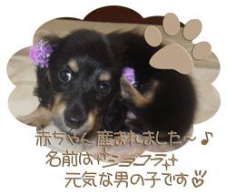 SUSY編を書こうと思いつつ・・・またまたまた延び延びで、早くも、さらに1ヶ月過ぎちゃいました。(;^ー^A アセアセ・・・と、その前に・・・この一ヶ月の子ども達・・・。まず第一子・・・TOM。毎日楽しそうに学校に行っています。そして、習い事も、くもん週二回と英会話は、自分からすすんで、机に向かい宿題をするようになり・・・母としては、一安心と思う一方、お勉強系の習い事をさせすぎ!?と思う点もあり・・・複雑な心境の今日この頃・・・。o(´^`)o ウーで、頭の中がしわしわ(お勉強系の発達)になるのもいいのですが・・・今は、カラダをめいいっぱい動かし頭の中を筋肉!?にするのも大事かな~と・・・それで、色々見学した結果、本人希望で、スイミングに通う事にしました。 /( ̄0 ̄)\ Oh No !!!!!!これ以上、習い事増やしてどうするぅ~~!と自問しつつも、しわしわ系と筋肉系で系統が違うし!?もし、合わないと本人が嫌がるようであれば、その時考えたらいいかなぁ~と5月から筋肉系習い事!?スイミングも追加となり、親子で大忙しですが、今のところ、楽しんで通っています。習い事前に、お友達と遊ぶ事もしばしばで・・・若いの~~~(*⌒―⌒*)って感じです。(年寄りな母ですぅ。 (;^ー^A アセアセ・・・)次は、第二子・・・LINLIN。じゃじゃ馬LINLIN・・・幼稚園で、男の子とばかり遊ぶだけでなく男の子を泣かしてしまうのでは???と心配でしたが、今のところ、そういう心配は無用で、逆に、女の子のお友達が増え、髪型が云々とか、今日は○○ちゃんと~○○ちゃんと~○○ちゃんと~○○ちゃんと~・・・・というように○○ちゃんは全て女の子で遊んだとか聞ける様になり、少しは、女の子らしくなったかしら!?という感じです。(*⌒―⌒*)そして、病気も、周りで水ぼうそうやおたふくやプール熱などなどが流行ったりという中、一度も感染症を起こすことなく元気に幼稚園に通っています♪6月に特定疾患の更新のため大学病院の診察に行く予定ですが、もう病名は取れて、完治!となりそうな予感♪晴れてそうなることを心から祈っている今日この頃です。(*⌒―⌒*)習い事も・・・これまたTOMが始めるとしたくなるLINLIN・・・。母的には、ただでさえ幼稚園が5月から午後保育となり毎日疲れてるだろうし、くもん週二回と英会話がある上、病気もまだ完治と言われてないので、感染症を受けやすいスイミングは避けたい!!!と思っていたのですが、LINLIN本人はTOMが体験した時点でやる気満々。で、どうせ続かないかなぁ~続けられないかな~と思いつつ、LINLINまで5月からスイミングスタートしちゃいました。(;^ー^A アセアセ・・・でも、意外や意外・・・。TOM以上にはまっているLINLIN。5月最終週にあった検定でも早速、昇級しちゃいました。(^ー^* )フフ♪というわけで、我が家の子ども達ここで終わりのはず!?ですが・・・な・な・なんと!第三子生まれました~~~!じゃじゃ~ん!!我が家の次男坊3/17生まれのロングヘア・ミニチュアダックスです。この写真は、我が家にやってきた時に撮った一ヶ月前の写真で、今ではすっかり男前な顔立ちに成長してきました。次男坊は、子ども達に人だけでなく、生き物みんなの命の尊さを自然と感じ取り、学んで欲しいと我が家にやってきました。(*⌒―⌒*)我が家にやってきて1ヶ月ですが、子ども達は、すっかりショコラのお兄ちゃんお姉ちゃんとなり、親子共々で、お世話をし、今は、トイレトレーニング中!?でまだ、失敗はありますが、トイレも少しずつ決まった場所でできるようになってきました。( ̄ー ̄?).....??ありゃ??SUSYの話をするつもりで・・・その前にちょっとだけ、子ども達の話を・・・と書き始めたはずなのに・・・子ども達の話だけで、立派な!?いやいやダラダラ長々日記のできあがり・・・(;^ー^A アセアセ・・・というわけで、SUSYの話は、また、日を改めて、【続き】ということで近々書きますので・・・よかったら、またおつきあいくださいませ~。今度こそ!?またまたご無沙汰でなく、近々に書けたら・・・と思います。(*⌒―⌒*)長々とおつきあいありがとうございました。m(_ _"m)ペコリ追伸:写真は、子ども達が 母の日に作ってくれた カレーです。 ごはんが色が変わって見えるのは・・・ 健康のため!?十穀米を 混ぜ混ぜしてるからです♪ ハートと星とお花型のにんじん すごく美味しかったですよ~ (m^o^m)うふっ追伸2:それと、リンクス始めました~。 詳しくは、ホントのSUSY編で 書きますが・・・ リンクスお友達になると、 うちうちなお話しがしやすくなり、 さらに、コミュニティもあり そこでは、 メーリングリストのように 同じテーマで BBS上やメールにて お話しできるシステムに なっています。 というわけで、 まだリンクスでお仲間に なってない方で・・・ SUSYと友達になってもいいよ って方がいらっしゃったら ぜひ、メールにてご連絡下さいね♪ リンクスへSUSYからご招待 したいと思います(*⌒―⌒*) (ただし、今までにHPなどなどで、 おつきあいのある
