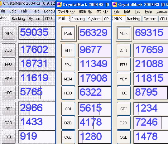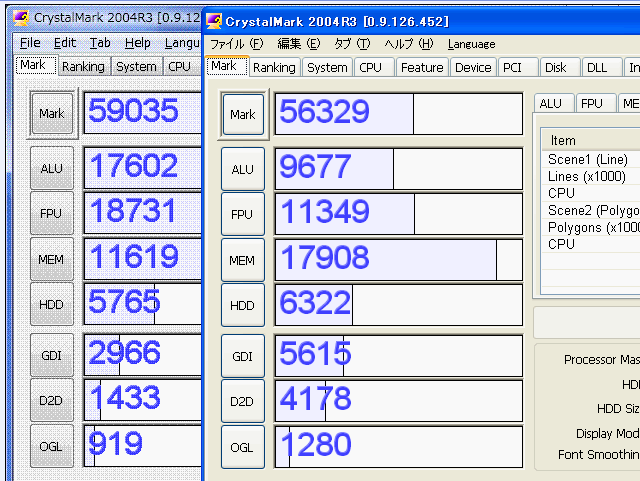 R61には評判があまりよくなかったVistaがプリインストールされていたが、いったいXPと比べてVistaはどうなのかベンチをとって調べてみることにした。 使ったR61は2台。いずれも、CPUは「Intel(R) Core(TM)2 Duo CPU T7300」メモリは2GB実装していて、HDDも同じ「SATA 300.0GB TOSHIBA MK3052GSX」を使用。同様なスペックなので、そのままCrystalMarkを使って比較することにした。(Vistaは、リカバリーを使ってOSをインストールし直し、XPは、R51のリカバリーから、ドライバなどを適応している。) 結果は、とっても意外(というか予想通りというか…)で、整数演算(ALU)、浮動小数点演算(FPU)では、Vistaがよい成績を修めたが、メモリやHDD、グラフィックいずれもXPの方がよい成績になってしまい、Vistaのよさは感じられない結果になってしまっている。ALUやFPUでVistaがよい成績を修めたのは、Core Duoへの対応ができているかいないかの差なのかもしれない。でもなぜ、メモリやHDD、グラフィックなど、後発のVistaの方が成績が悪いのだろうか?(システムが肥大化して重くなってしまっているってこと?) Vistaの評価はやはり噂どおり?(左がVista 右がXPの結果)