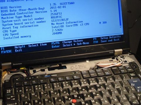 外部ビデオコントローラー(GPU)「ATI MOBILITY RADEON HD 3470」搭載のR500(2732-A19)には、現在、LEDバックライトのWXGA液晶が接続されている。※明るいLEDバックライトなのだが、せっかくなのでもっと解像度が欲しい。 もともとこのR500はジャンクなシスボ状態で手に入れて、ここまで復活させてきたものだが、オリジナルなスペックを参照すると、どうやらWSXGA+液晶だったようである。http://www.inversenet.co.jp/pclist/product/Lenovo/2732A19.htmlCore2DuoP8600/2.4G 2G 320G DVD±R DL/±RW/-RAM 無線LAN Bluetooth 15.4TFT WSXGA+ WinXP Pro 幸いにして、手元にはWSXGA+液晶「LG.Philips製LP154W02(FRU P/N:42T0423)」が余っているので、付け換えるだけでOKのはずだ。 ということで、早速作業開始…。 ところがWSXGA+液晶に載せ換えてみたら、WSXGA+表示されるが、なんだかバックライトが暗い。しかも表示されている字がはっきりと読めない。なんだか、間引きしたような表示なのだ。解像度を落としてみたり、表示フォントサイズを変えてみてもダメだった。※WSXGA+表示されるが、間引きされたような文字しか表示されない。 これはやはり、LCDケーブルの問題か? 確かR61eのLCDケーブルはWSXGA+に対応していないので、正しく表示されないという実例があった。 R500でも同様なことが考えられる。(ちなみにT61やT500/T400では、LCDケーブルが様々な液晶ユニットに対応しているようで、ユニットをポンづけするだけで、変更でき る。)※R61のLCDケーブル(左)とR500のLCDケーブル(右)見た目は同じ。 LEDバックライト液晶に搭載されていたのは、「FRU P/N:93P4449」。これをWSXGA+液晶搭載のR61から取り外した「FRU P/N:93P4450」に交換して試してみる。 もちろん、R61でも問題なく使用できていたので、R500でも今度は問題なく表示された。 つまり、R500の液晶を高解像度のものに交換しようと考えたら、LCDケーブルさら交換しなければならないということだ。※WSXGA+液晶への換装が完了したR500(2732-A19)。これで言うことなし?Core2 Duo P8700(2.53GHz) / 2GB / 250GB / WinXP Pro / 商品ランク:B 【無償保証6ヶ月】中古ノートパソコンLenovo ThinkPad R500 2714-R47 【中古】 Lenovo ThinkPad R500 中古ノートパソコンCore2 Duo WinXP Pro Lenovo ThinkPad R500 中古ノートパソコンCore2 Duo WinXP Pro☆安心!30日間無料保証☆送料無料【中古パソコン】【Windows7 搭載】【メモリー2GB搭載】【HDD160GB搭載】【DVDコンボ搭載】【中野店発】 lenovo ThinkPad R500 (2011750)