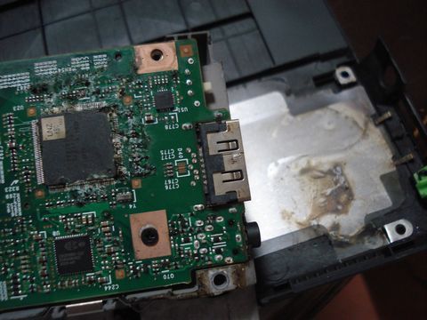 分解してシスボを取り出すと、この不動の原因が判明した。コーヒーだろうか?何かが浸水した痕が右手前eSATAスロット付近に見られ、チップの腐食が進んでいる。これはさすがに修復できないだろう。