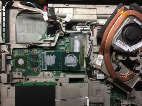 ※キーボードとキーボードベゼルを外すしたT520のシスボ。CPUファンを外せばCPU換装可能。