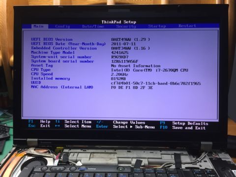 ※T520のBIOS画面。しっかりと「Intel(R) Core(TM) i7-2670QM」と認識されている。