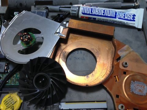 今までもよく行ったように、cpuファンを分解して、ヒートシンクや羽根に溜まった汚れを取り除いて、田宮のモリブデングリスを軸に挿して組み立てる。