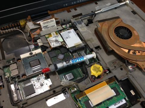 ついでにcpuもCore2Duo/T7200に換装する。シリコングリスは、熱伝導率4.8W/m-K(ワット毎メートル毎ケルビン)のGD900を使用した。(そんなに高性能のグリスではないけど…。)