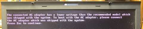 これは、「ACアダプタの電力が足りない」とのメッセージ。現在使用している90Wタイプの電源アダプタではACだけでは起動できないようだ。