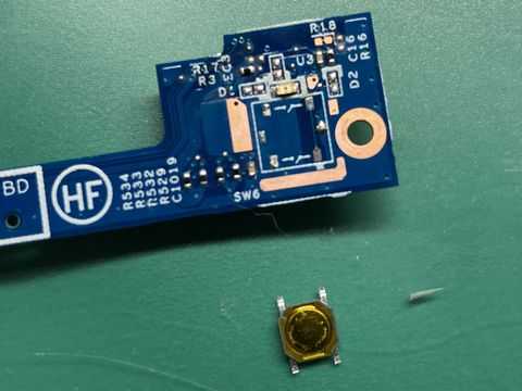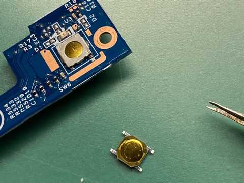 スイッチ部分を分解して確かめてみると、スイッチユニット基板上の「タクトスイッチ」の動作が怪しいことが判明。ボタンを押しても、通電しないことがあるようだ。