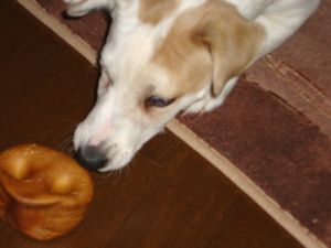 ラスティへのお年玉(笑)それはこの「ブタの鼻」!!!「牛のひづめ」に引き続き、ワンコがいなければ、絶対に手に取らないモノシリーズ第2弾ですね~(笑)鼻の形そのままがリアルで相変わらず、リチャードは気持ち悪いって触るのを嫌がりますが(ってか、食べさせるのも嫌みたいだけど)でも、ラスはすっごく喜んでまたまた格闘しているので良いではありませんか~♪(^▽^) そんな目をしなくても、誰も取らないよ。。。カロリーは高そうなので、与えすぎは要注意ですね~。。。ペットジャーキー 豚鼻