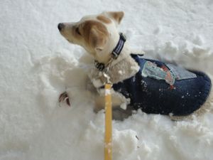 やっぱり、リード無しで走らせてあげたいので休みの日はほとんど、ドッグランに行きます。柵の中に入るまでは、リード付きですが、だいぶ覚えたみたいで、車から降ろすと自分でどんどん、ランの方へ向かいます。 他のワンコがいない時は、かーさんと走るっきゃないわけで、もっと離れて走ればいいのにやけに側にくっつきつつ、走ってます。踏みつぶしそうなんですけども。。。自分がすっぽり埋まるくらいの雪の中でも平気でとび跳ねながら、走ってます。ラッセル車が、雪の中を走ってるみたい。ジャックラッセルだけに・・・(お後がよろしいようで。。。)