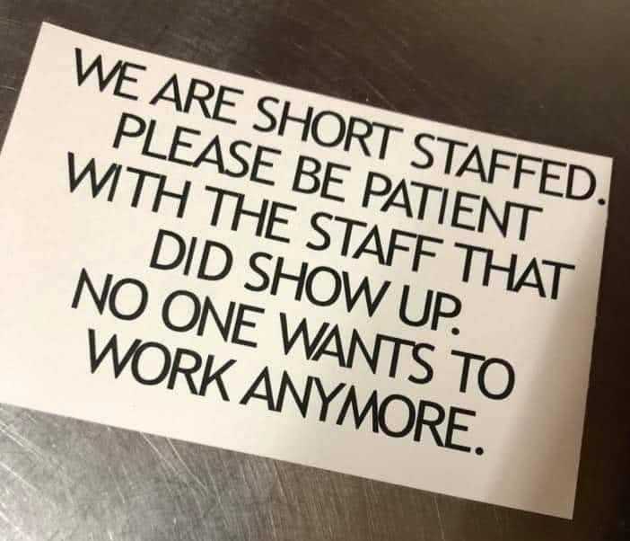 「 人手不足です。仕事に現れたスタッフの(遅い)サービスを我慢してください。