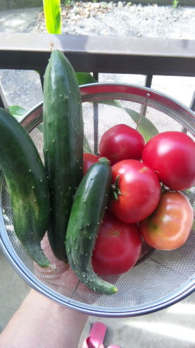 いびつです。きゅうり。。。でも中玉トマトはそれなりに。台風で株がダメにならなければ、もっと質の良いのが採れたのに。農家って大変