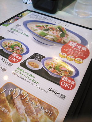 今日は宮前平でランチタイムたまにはリンガーハット長崎チャンポンの麺増量サービス中~♪もちろんMAXの二倍大きなドンブリがやって来ました食べてみるとスープが負けぎみお店の人に特製塩ダレを持ってきてもらいましたしっかりスープのうま味がパワーアップガッチリ麺とスープが絡みましたなんかやけに柔らかい中太の麺はそれ自体の旨さがいつもと違ってかなり冴えない麺増量の裏事情もいろいろ有るようだ