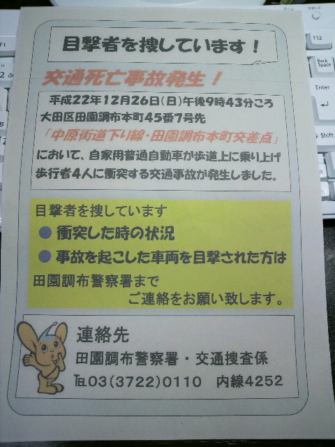 今日は帰りが遅くなりました]帰り道は中原街道下り線田園調布本町交差点12月26日にあの事故が起きた時間だ道路は行く手を警察官に誘導され検問がありましたあの事故の目撃者を探しているようです あの事故でお孫さんが2人亡くなりました悲惨な事故現場はそこを通る度に暗い気持ちになります衝突した時の状況や事故を起こした車両を目撃された方は田園調布警察署まで連絡してお願いしますクリスマスが終わった日曜日温泉に向かった若者たちの浮かれた気分で出しすぎたスピードは交差点で犬の散歩に出かけた人たちのいる歩道に突っ込みました悲しい出来事です