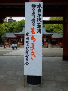 花鳥園へ遊びに行ったときに元旦に生田神社で買ったお守りを返そうと神社へ寄りましたすると・・・神戸まつりのたぐいでモチまきが開催されるようですたまたま神社に着いたのが17時3分前でしたおーすごい偶然!もちまきなんてイベント初めてだったんでテンションが上がる中いそいそと人だかりの方向へ建物の中からダンボールを担いで縁側に関係者が並びだしましたするとどこからともなくドーンドーーン!と太鼓の音が!太鼓の音に合わせて一斉にモチなげが始まりました建物から遠慮がちにいた人だかりが縁側の真下にまで接近しこっちに投げて~の意味なのかみんなそれぞれ両手を上に上げてパンパン手を叩いてました投げるほうも手前の人にならばモチを落とす感覚で投げればいいんですが結構遠いほうへ投げるときは振りかぶって投げるんですモチを振りかぶって投げるんですよ?弧を描いて落ちてくるんでなく直線的かつ結構なスピードで眼前に迫ってきます待ちに待ったモチが迫ったんですが反射的に危機感を感じて上半身を横にひねったら首にドスっと当たり足元に落ちましたモチ拾えたけど・・・痛い・・・それから怖くなって足元に落ちたやつだけを狙ってましたご主人と2つずつ、合計4つ拾えました赤3つに白1つか~ってご主人をみるともうすでに1個食べてました・・・特にあんこは入ってなく味もしなかったようですそれならばお汁粉にしてみようかなと思ってた矢先・・・火曜日の朝にはこんな残念な結果に福が・・・。