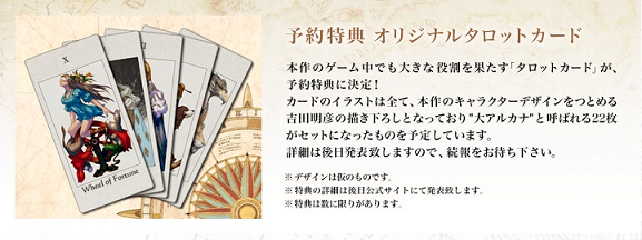 タクティクスオウガ運命の輪宣伝チームさんのつぶやきから(一部)---先日、吉田・政尾両氏の取材がありました。掲載日が確定しましたら改めて公表しますね! #TacticsOgre 約3時間前 webから 予約特典のタロットですが、通常のトランプ型ではなく、イラスト通りちょっと長いカタチのもので、しかも当初の予定よりもサイズを大きくすることが決定しました。予算的には……ですが、せっかくだし、いいもの作ろうと営業も協力してくれました。感謝!#TacticsOgre 5:16 PM Aug 30th webから 宣伝チームには前作経験者、初心者が入り混じってますが、どちらもすごい楽しめてます。発売までもう少しですが、まずはTGSへ向けて、皆さんには色々と情報を公開していきます!ちゃんとトレーラーは公式サイトでも公開するのでご安心を!!ではスタジオ行ってきます! #TacticsOgre 4:47 PM Aug 27th webから .@YasumiMatsuno 初心者的にはメインのルートだと、誰か犠牲にするか、C.H.A.R.I.O.T.を使って切り抜けていってなんとかクリアしてる感じです。こちらは歯ごたえがありますなー。 #TacticsOgre 4:33 PM Aug 27th webから YasumiMatsuno宛--引用おわり---ちょっとぉおおΣ(゚∀゚ノ)ノキャー予約特典のタロットが凄そうですねせっかくだからいいもの作ってくださいな縦長でちょっとトランプよりちょっと大きめなら吉田さんのイラスト堪能できますってもんです吉田さんと政尾さんの記事が見れるみたいですねふんふん、コレ要チェックいままでの戦略は全く通用しないということらしいですがそうこなくっちゃという感じですよねむしろ難易度上げてもいいし難易度変更出来るくらいでもいいんじゃないかと自分で敵の人数増やせるとか~ずっと遊べてしまうわ・・・うーん、テスターだったFF14が私的には不発だったためその分のパッションがこっちにきちゃいましたまだFANサイトが出来てないんで1人で祭りをしようと専用blogを準備中です