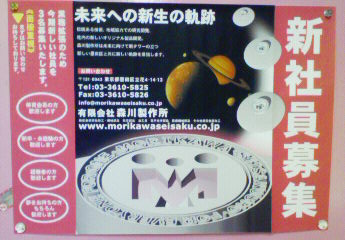 現在。人材を募集しております。経験者・未経験者はといませんが、体育会系、理数系、手先の器用な方に向いている仕事だと思います。勤務地: 東京都墨田区立花4-14-13募集職種:工場にての生産技術 加工品例:航空機部品・医療機器部品・理化学器部品・バイク部品・ショーウインドウ商品 当社デザイン品etc・・・・作業内容:NC、マシニング、旋盤、フライスなどの機械作業給与:当社規定による諸手当:交通費(上限あり)、家族、住宅、資格昇 給 :年1回賞 与 :年1~3回(8月、12月、決算)勤務時間 :8:30~17:30実労7時間30分休 日 :日曜・祝日・隔週土曜日・夏季・年末年始当社規定カレンダーによる教育制度:新人社員研修、資格取得援助、昇進・資格試験福利厚生 :各種社会保険(2008年・秋加入予定)労災、社員旅行、制服、安全靴 年1回健康診断社内親睦会募集職種:工場にての生産技術 提出書類 :履歴書写真貼付で、住民票、健康診断書 選考方法:面接重視 その他: ノギス(検査時具)は個人負担していただく場合がございます。研修及び、お試し期間: 3ヶ月間~お問い合わせ:03-3610-5825(平日、午前10:00~午後5時) FAX 03-3610-5826(24時間OK ) info@morikawaseisaku.co.jp/採用係担当者宛てまで ほんと~~に筋金入りのアットホームな会社です。お昼は、会長が釣った川魚焼きが出るときもあれば、会長が料理した山菜のおかずなども出ます。仕事が終わると、飲みに行ったり、会長宅で一杯やる時もありますBy某従業員Sさん新たな仲間になる方、お待ちしております(有)森川製作所/Web担当