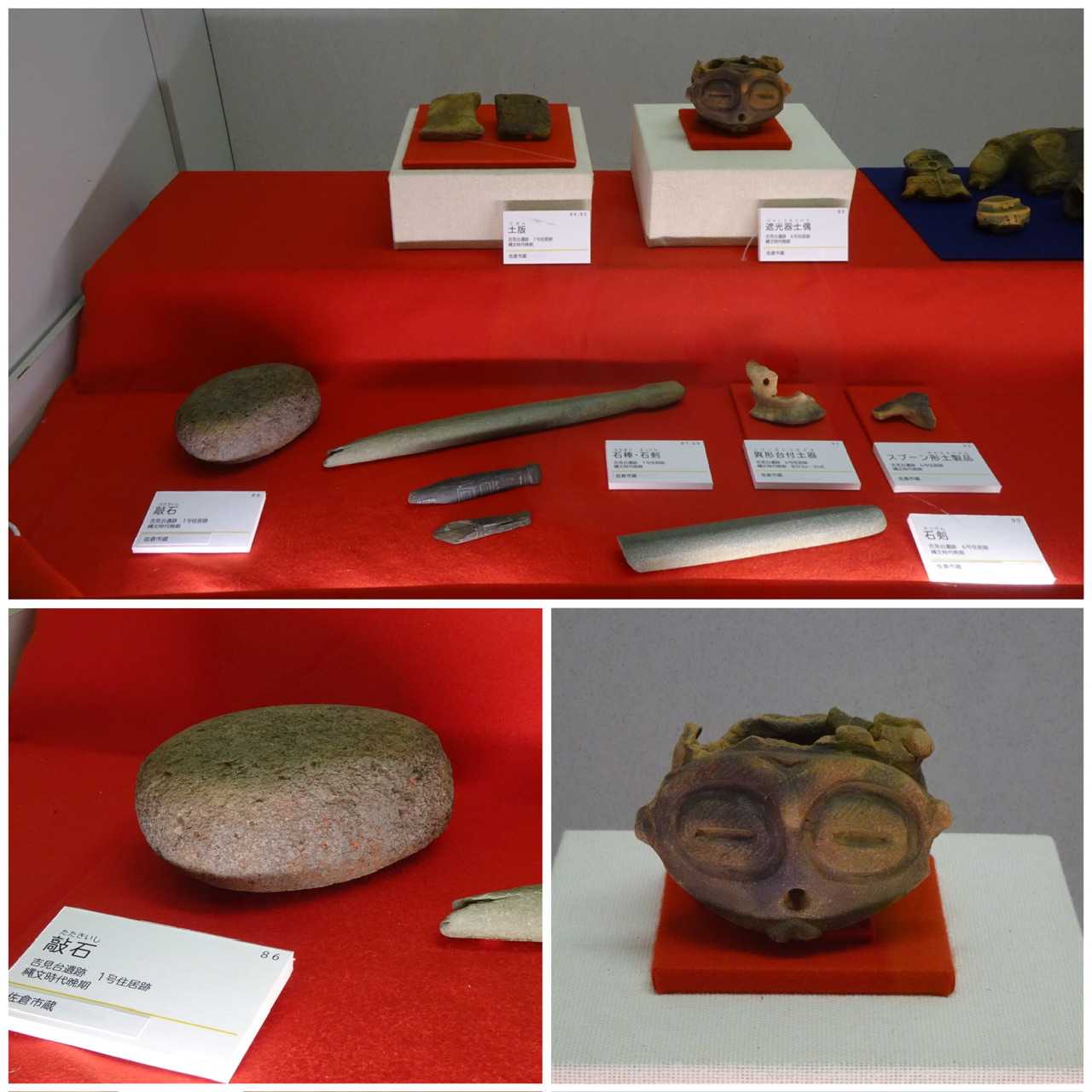 左下:赤彩が残る敲石  右下:6号から出土の土偶