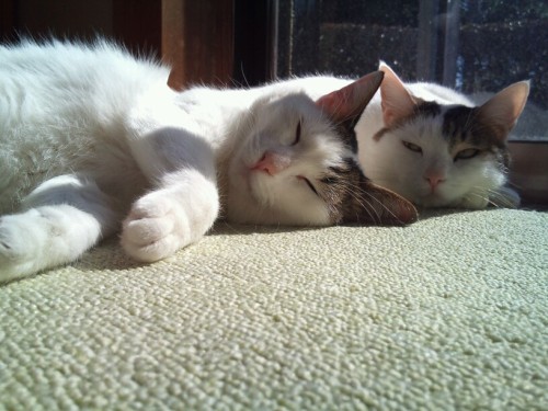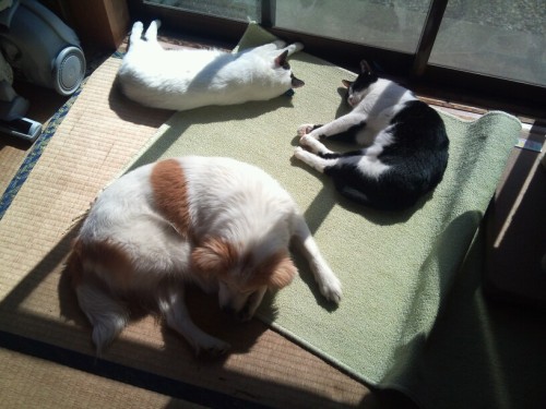 昨日は暖かかった窓辺はお日様ポカポカで、ついウトウトしそうな陽気毎日、掃除に片付けと大変だけどこんな姿が見れると、それだけでいつもの苦労は帳消し それにしても、やっぱりそっくりだよねミルクとクルミ!まあ 性格はまるっきり逆だけどね~こんな のんびりした 日曜が過ごせるように早く 仕事が落ち着くようにしなきゃ(>_<)