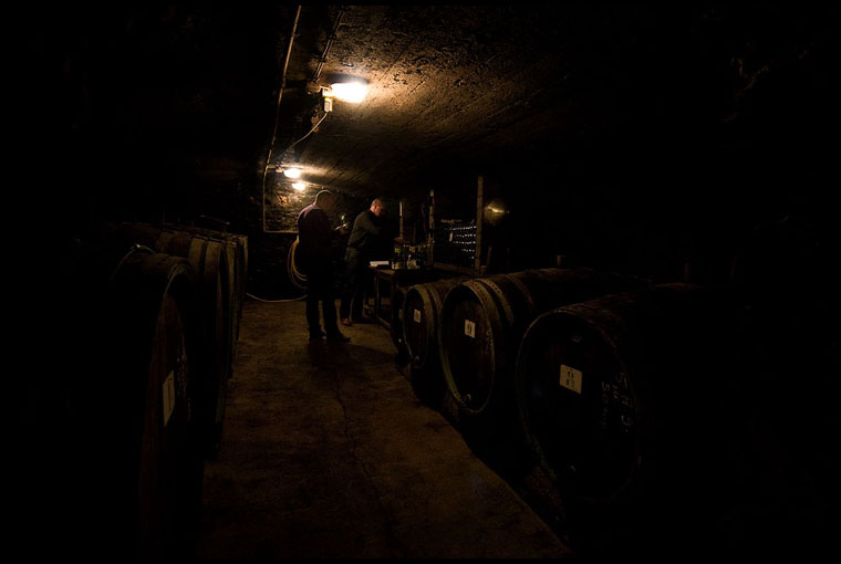 醸造設備。選果台と破砕装置。モーゼルで手作業の収穫した上、さらに圧搾前に選果作業をする醸造所はあまりない。ヨッヘン・ジーメンスが醸造所を購入してから5年の歳月が過ぎた。2006年の仕打ちを償うようにして、自然は2007, 2008, 2009と3年続けて良年をもたらした。その間、醸造設備も約160万ユーロ(約2億800万円)をかけて刷新された。醸造棟に一歩足を踏み入れると、目の高さの壁に空調装置がでんと据えてあり、地上にあるホールから既に温度管理が行き届いていることを示している。一角には収穫を冷却する冷蔵室もある。醸造所のあるザール川沿いに広がる13haあまりの急斜面から持ち込まれた収穫は、ここでまず手作業で選果され、果梗を取り除き、冷却しながらの圧搾が可能な最新式マシンで圧搾する。得られた果汁はポンプを用いることなく、重力を利用して地下一階のタンクに流れ込み、清澄後に再び重力を利用して地下二階に流れ込む。礼拝堂の様なアーチ型をした天井のセラーは年間を通じて約10℃に保たれ、容量1000~2400Literの木樽とステンレスタンクが通路を挟んで向かいあわせに整列し、木樽で発酵後ステンレスンクで熟成したり、あるいはステンレスタンクで発酵後木樽で熟成と、目指すワインのスタイルに応じて使い分けているという。発酵は野生酵母で行い、畑の個性を生かす。おそらく先代オーナーがうらやまずにはおれないほど完璧に整った醸造施設に、ケッセルシュタット醸造所などで働いていた経験豊かなケラーマイスター、フリッツ・レンツを醸造責任者に据えた。醸造設備は完璧だ。おそらくファン・フォルクセン醸造所にもひけをとらないだろう。これで高品質なワインが出来なかったらどうかしている…。醸造所のセラー、地下2階。(つづく)