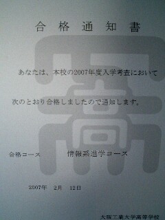 最近マジで赤本とかやってたからブログの更新が・・・・・でもまぁいいか(´∀`)さて、3日前の2月9日は私立の入試でした。その日の朝は普段ならあり得ない6時に起きました。朝食は食べ過ぎずに頭の回転が良くなるとかいうチョコレートを食べました朝から甘いのは無理。かなりきつかった・・・・で、最後の仕上げとして入試問題のプリントをやって受験校に行きました。受けたのは大阪工業大学高校の情報系進学コースを併願で。俺の学校からは自分とあと2人の男子がこの情報系を受けました情報系は3人だけやったみたいですが普通コースは学校からかなりの人数が受けてました。 多分10人以上で、なんか教室に入ったら全く緊張しなかった。 奇跡や・・・・・俺は緊張すると腹痛で集中が出来なくなるのでマジで助かった!!なんでやろ? 五ツ木で苦しんだからかな??テストは理科以外はまぁまぁかな・・・・って感じです。数学も意外と出来たし、国語なんか塾でやった古文が出た。 奇跡や・・・・!!!社会・英語も過去問よりはいい点数やと思いますそして今日、朝9時ぐらいに親に起こされたら・・・・結果来てた これは自分で封筒開けて見た方がいいということで結果を見たら・・・・・・・・・・・・・・・・・・・・・・・・・・・・・↓おぉぉぉぉぉ!!!!!!!!! 合格しとる!!!! ヨッシャァァァ!!!! 第一関門クリアや!!あとは23日の前期公立試験だけ・・・・・ 頑張ろう!!
