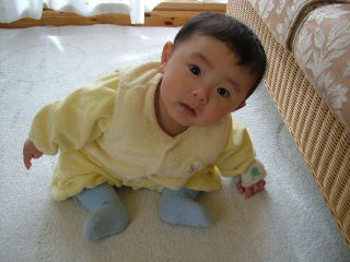 気が付いたら、あっという間に半年が過ぎ、康太はこんなに大きく元気に育っています。ありがたいことです。去年の今ごろは、やっと安定期に入って、健診に行くたびにお腹の中の康太に会えるのを楽しみに、そして毎日少しずつ感じる胎動に感動していました。 お腹の中でも動き回って元気だったけれど、最近は本当に足が強い元気な子だなぁって思います。まだ寝返りも出来ないのに、ちょっと脇を支えてあげると、脚を真っ直ぐにして、立てるんです。それでも寝返りをしないってことは、うつ伏せが嫌い? そうそう、康太は、先週の金曜の夕方、三種混合の予防接種を受けてから、昨日の21時まで便がでませんでした。昨日の21時にやっと大量にだしたのですが、澱粉のりのようなドローンとした水分不足のウンチでした。離乳食を始めると便秘になる子がいるって先輩ママから聞いていたので、食事をあげながら、スプーンでお茶やお水もあげていたけれど、足りてないのかなぁ?食後も結構オッパイ飲むから大丈夫って思っていたけれど、少ないのかなあ?マグで飲むのが嫌いだから、食事以外の時の水分補給は全てオッパイにしてるのがいけないのかなぁ?あまり気にしなくってもいいのかなぁ?