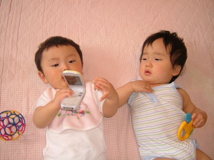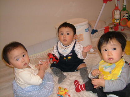 歩行器にのって、上機嫌で遊んでたときのことでした。延長コードをさしっぱなしにしてあったのを見つけて、ぶんぶん振り回していたのですが、その直後、ちょっと目を離した隙に大泣き。かけよってみると、コンセントの差込部分をべろべろに舐めた形跡がありました。きっと感電したんでしょう。というわけで、すぐにこれは撤去しました。 そのあと...またまた歩行器で遊んでいて、私が台所で洗い物をしていたところ、ガシャーンという音と、けたたましく泣く声がしたのでリビングに戻ってみると、いない。何で?と、玄関を見てみたら、歩行器のまま逆立ちのような状態になっていました。 びっくりして、旦那を呼びました。旦那が外へタバコを吸いに行ったのを追っかけてしまったようでした。おでこには大きなたんこぶ、ほっぺには擦り傷。そして、洋服の肩と腕の部分が汚れていました。 みんなこうやってたんこぶつくって成長するのでしょうけど、私も康太の成長に合わせて危険を予測できる母親にならないといけないな、って反省した一日でした。