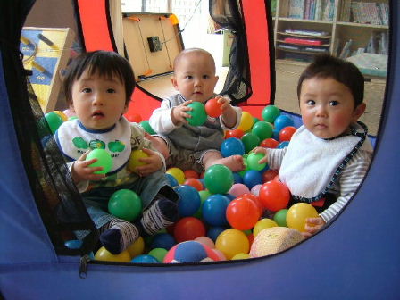 今日は、仲良し館で絵本の読み聞かせがあったので、お友達と行ってきました。終わってから、今日は大きい子供がいなかったので、ボールのプールに入れてみました。年末に遊びにきたときは、この中に入れたら大泣きしたけれど、今日は、このとおりおりこうにしてました。 旦那にこの写真見せたら、「我が家にも設置した方がいいら~」だって。とんでもないっ!こんなの置いたら狭いところが余計狭くなってしまう...でも、柵で囲って屋根なしでボールプール作るだけならいいかも。