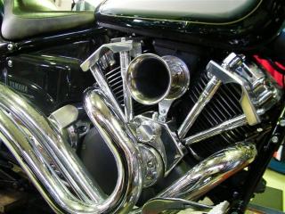 先日すっかりはめられて預かったドラッグスター400しょうがないので始まりましたまずはプッシュロッドとファンネル → コレは当然問題なくすんなり装着。(エンジンとVロッドの間に店長の手が挟まって抜けなくなったこと意外は・・ケケッ)こんな感じ。 なかなか格好良いです。で、次は問題?のグースネック。まずはヘッドライト、フロントフォーク、トップブリッジ、ステムをはずして前周り取っ払います。ホース、ワイヤー類はつながったままなので「誰かー!持ってて!」それはムリなので上から釣っちゃえ!ついでにバイクがこけても大変なのでバイクも釣っちゃえ。すっかりぶら下がっています。ストレッチフレームにノーマルのレースを打ち換えて取り付けおぉ~! フレームが!延びた!すごい。いい感じさぁ、トップブリッジを戻して・・・クラッチワイヤーが ・・・届きませんて。アクセルワイヤーも届きません。ハーネスも・・・。まぁ、予想はしてましたけど・・。持ってきてもらった部品のチェックをしたときに「ロングワイヤー入ってないでー」「え~?いるの?無いで~」ってな会話してましたねしょうがない・・家捜しするかぁ。 つづく