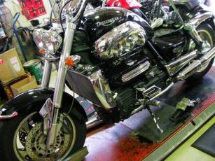 先日タイヤ交換でお預かりした車輛です。トライアンフ ロケット3タイヤ交換で数日お預かりするなんてことはあんまりないのですがちょっと重量級だったのでお預かりすることに・・リフトがいっぱい、いっぱいどのくらい重量級かというと、・水冷4ストDOHC並列3気筒 ・排気量2294cc ・最高出力142ps/6000rpm・最大トルク20.4kg-m/2500rpm・乾燥重量320kgほら!とにかくでかい!(うちが2人とも小さいのでよけいそう思うのかも!?)タイヤも240!チェンジャーに置いたホイールはまるで筒、とてもバイクのものだとは思えません。かなり腰にくるみたいです。大きな車体の割りにはヒラヒラと乗りやすそうなこのバイク、作った人たちが乗るとこんな風に乗れるんですね↓おもしろすぎるトライアンフ ロケット3いやいや、おかしい、おかしい 絶対おかしいしかもバイクがちっとも大きく見えないよ