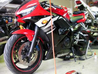 YAMAHA R-6 2003モデル普段乗るにはちょっと足ツキが悪いということで、ローダウンです。作業前です。プロト EFFEX ローダウンリンク&ショートサイドスタンドを取り付け。バランスを取るためにフロントは突き出し。作業完了で約3cmダウンオーナーさんにまたがってもらうと、「・・・」ヨカッタヨカッタ乗りたいバイクを安心して乗れるようにカスタム、それってぜったいいい考え ですよね。 ← 「ポチッ」と押したくなりました?