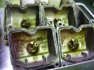 3月も半ばになろうかというのに昨日は雪が降ってました。今日もなんだか寒そうです。先週末少し暖かかったので「そろそろ・・」って思ってた方も多かったはず。東北地方の方たちのためにも、もう少しあったかくなってほしいです「しばらくかけてなかったら、エンジンがかからなくなってしまった」の3大原因の一つ、キャブレターのつまり!キャブの中に残ったガソリンが固まってしまったり、何かの原因でゴミが詰まってしまってガソリンの通る穴をふさいでしまい、エンジンがかからなくなってしまうというタイプです。数か月以上乗らない場合によく起こります。とりあえず、キャブレターを外してばらします。今回はガソリンが傷んで・・というよりは、錆びが回っているようです。カフェラテ・・???洗浄のためにキャブクリーナーを通してみたところ、こんなのが出てきました。写真だけ見てるとおいしそうなんですえどねぇ。こんな作業をきれいになるまで何回も、時には数日かけて行います。あまりにひどい場合はジェット類を交換するのですが今回は洗浄で行きます。洗浄には泡タイプがお勧め!泡で包んで汚れを落とします。ひどい場所は浸け置き洗いですこの作業でキャブレターはすっかりきれいになったのですが、今回はこの錆びのもとをなんとかしないとだめそうです。バイクのメンテナンスのことなら!MOTO PEACHBOY ← 「ポチッ」と押してくれるとうれしいなぁー