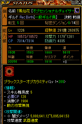 まず、ドーピングなし素のステ・表記です。ほぼ完全回避が可能なので、耐久は削っていってます。次に旗バフ有の狩り時の表記ダメです。だいぶ上がりました。これで荒れ地のデブも8割は1発で倒せるようになりました。あともう少し組み合わせを改良すれば、1発確定で狩れるようになるかも?強くなったのは良いのですが、見た目がねぇ・・全然可愛くないというかきもい^^;弱化強化メモ(魔道戦士型)☆魔法強化・武器192%・耳105%・鎧7%・手32%・腰50%・クリーチャー20%・MB3%・指16%・勇猛1段階5%・錬金術20%合計427%+20%(錬金)☆闇強化・手30%・足45%・十字架110%・指50%(太極Nx5個)・クリーチャー75%・クレスト40%・頭88%合計438%☆魔法弱化・武器30%・クリーチャー6%・耳15%・頭12%・鎧15%・指8%・クレスト27%・手8%合計121%☆闇弱化・手30%・首14%・クリーチャー45%・腰20%合計109%☆魔法致命・武器14%・鎧10%・手8%・頭7%・指1%・クリーチャー30%・スキル30%(次元扉の鍵)合計100%