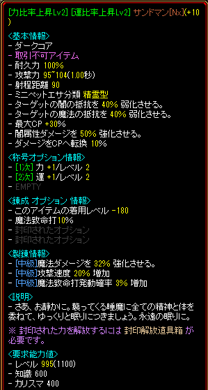 魔力のお守りが成功しないので未完成です。このサンドマンを使ったら、弱化の偉大さを思い知りました。どういうことかと言いますと、↓サンドマン装備時の表記です。”魔力の”がまだないので、魔法強化が344しかありません。しかし、魔法弱化&闇弱化120%↑となっております。それに対して、↓は分裂使用時の表記ダメです。魔法弱化120%↑ですが、闇弱化が109%と上限に達しておりません。表記514万で弱化MAXのサンドマン使用時は、荒れ地デブが1パン確定でした。表記541万で魔法弱化120%↑+闇弱化109%では、荒れ地デブが8~9割は1パンですが1~2割程度生き残ってしまいます。というわけで、弱化というのは本当に重要なんだなーと再確認できました。サンドマンに魔力のを付けて、あと何か少し工夫して魔法強化400%にして狩りしていこうと思います。今回はこれで終わりにします。