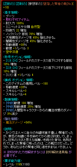 こんなの作ってみました。T全吸収DXの4解放が300本と安かったので、改良して使うことにしました。買ったときは、T全吸収DX・製錬5・勇猛なし・BFはSSのOPが付いていました。とりあえず、4解放で300本ならきっと元が取れると計算したわけです。しかし、RSにおいて確率はあってないようなものなので、そんなに甘くはなかったですなw↑これをいったい何回やったかと言いますと・・↑弓で使っていた精霊王のなれの果てですw魔道戦士が出来たら、弓と黒魔で兼用すればいいと思って犠牲にしました。これだけで作れていたら悪くはなかったのですが、実際はそんなに甘くはなかry↑黒魔で使っていた精霊王のなれの果てですwというわけで、全吸収ULT+賢者+上級抽出を合計5回実施してやっと成功しました。掛かった費用は、全吸収ULT110本×5+賢者105本×5+上級抽出10本×5=1125本ベースが300本だったのでここまでで1425本となり、勇猛付けて製錬10に上げたので1500本くらい掛かったことになります。うーん、得はしていませんが、4解放を自分でやったら最低でも800本掛かるので、ちょい負けくらいだと思っておきます。この頭には勇猛を付けましたが、弓は頭抜きで純粋が5箇所付いているので問題ありません。さらに弓は、BFOPのダブクリ増加5%が3箇所付いているので、そのうちの1つを被魔法吸収に変更すれば石像込みで全吸収100%になります。黒魔は、首にもBFの被魔法吸収15%が付いているので、この頭で全吸収100%になります。精霊王に付いていたBFOPの魔法弱化17%が無くなりますが、サンドマンを導入したことで魔法弱化がだいぶ超過していたので問題ありません。装備Lv1289なので、当分は30バッジを購入して使いますが、もう課金再開したのでどうということはありません。だって上級抽出失敗しまくって賢者が買えなくなったからブチ切れてロト1万円分買って賢者出して成功させましたからねwそれでは、これで今回は終わりにします。