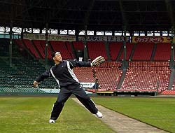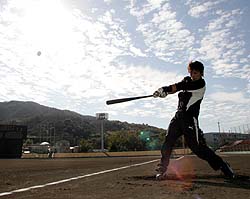 逆襲や!虎・今岡、首位打者獲り返す!直線描く軌道、送球OK!鳴尾浜で本格始動した今岡。スローイングも昨秋当時とは雲泥の差だった 視界良好や!! 阪神・今岡誠内野手(32)が11日、鳴尾浜球場で本格始動した。右手中指のバネ指手術からの復権へ、守備練習では力強いスローイングを披露。「打撃は放っておいても(大丈夫)」。定位置の三塁に戻ることさえできれば、打棒復活には自信あり。03年の“首位打者打法”への回帰で、不死鳥のごとくよみがえる。◇ グラブを弾く乾いた音が、復活への息遣いのように聞こえた。昨年秋には山なりだった送球の軌道は、冬を迎えて直線を描くようになった。再び『サード・今岡』をコールされるために…。孤独な戦いは、そのまま“首位打者打法”を取り戻す道と重なっている。 「ここまでオフに守備練習というのは、レギュラーになった5、6年はやってないですね。打撃は放っておいても(大丈夫)。守備をやっておけば違ってくると思う」 この日、鳴尾浜球場で本格始動。とはいえ昨季終幕後、今岡にオフというオフはなかった。この日もノックを30分間ぶっ通しで受けると、約30メートルの距離でスローイングを繰り返した。定位置・三塁から一塁への距離には10メートルほど足りないが、投げ込むボールに伸びと勢いが戻ってきた。 背水の2文字で今季を迎えながら、バットへの絶対的自信は失っていない。守備の不安を消し去ることを念頭に、本格的な打撃は長く封印したままだ。「守備を試合でしてない不安はある。不安をゼロにすることは難しいが、消していくのが最大の課題」。守れる状態にさえ戻れば、元通りに打てる。確信がある。 昨年6月に右手中指のバネ指)の手術を受けたが、それを引きずっていた歳月は驚くほど長い。昨年秋から一軍守備走塁担当に転身した和田コーチは、「指の状態も含め、最も状態のよかったのは03年」という。星野阪神の核弾頭として首位打者(打率.340)となったシーズン以降、痛みと違和感を抱えながら、天性のセンスで数字を残してきた。今岡が本来の実力を発揮できたのは、4年前のほんの一瞬だったとも考えられる。 昨年10月からの連日の守備練習で、下半身にシンが入った。指の不安も消えつつある。崖っ縁の07年は、不安なく打席に立てる久々のシーズンにもなりそうなのだ。まずは関本らとの競争も覚悟しているが、もちろん負けるつもりはない。 「当然、競争がある。(5番復帰については)今はそういうところまでいってない。試合に出たい若い選手がいるわけで、それを跳ね返していかないといけない。(打順は)それからの話です」 再びホットコーナーに立つために、逆襲のノロシは静かに上がった。★相棒も発注済み 今岡の新バットが間もなく手元に集まる。昨年12月5日に愛知・豊川市内のバット工場を訪れ、3タイプを発注。すでに一部が届き始めており、品定めに入る。 「まだ全部は届いてないけど、もうすぐ来ると思う。1月中に試したいと思っています」 そのうちの1本は、昨季のア・リーグ首位打者に輝いたマウアー(ツインズ)のバットを参考にした。現在、本格的な打撃は封印しており、相棒選びからスタートする。■今岡の過去の始動VTR ★03年 1月14日、前年に続いて同期入団の浜中と和歌山・南部で開始。星野監督から「1番・今岡」を宣言されており、今岡は「『こいつ打つなぁー』と言われるような1番打者になりたい」と意欲を語った ★04年 1月12日に高知・安芸入り。キャッチボール、走り込み、ウエートトレなどを行った。03年終盤に痛めた左肩を気にして、キャンプまではバットを握らずに調整を続けた。 ★05年 1月10日、ハワイへ出発。初の海外自主トレで「肩中心に強化していきたい。ウエートトレ中心になりますね」。温暖な地で体を作り上げた。 ★06年 1月9日、甲子園球場で。「阪神では連覇は過去にない。このモチベーションは最高」。個人目標に関しても「いいイメージが出来上がっている。連覇にいかに貢献できるか。それが第一」と言い切る。久保田が早くもブルペン!抑えで“復肩”…キャンプ待っとれん!背中に「攻」の文字の入ったシャツを着て、ブルペン入りした久保田。今季に懸ける決意の表れだ 阪神・久保田智之投手(25)が11日、鳴尾浜球場で例年より約2週間も早くブルペン入りを敢行した。年俸200万ドル(約2億4000万円)で獲得したエステバン・ジャン投手(31)=前ロイヤルズ=の加入で、来季の開幕ローテの顔触れが浮かび上がる中、優勝した05年と同じ抑えで復権を目指す剛腕はキャンプインが待ちきれないでいる。◇ バシ~ン!! 鳴尾浜球場のブルペンに力強いミット音が鳴り響った。普段は感情を表に出さない久保田の口から、何度も雄叫びが上がった。 「きょうは温かかったので、例年に比べて特別(ブルペン入りが)早いという意識はない。ただ、これまでずっと投げてきてきたので、肩の準備はできています」 この日午前の気温は7度だったが、今季に懸ける熱い思いが寒さを吹き飛ばした