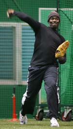『2枚刃フォーク』披露!新助っ人・ジャン、甲子園で初練習!来日から一夜明けたジャンはさっそく、甲子園に乗り込んで肩慣らし。変化球も試投した 名刺代わりの『2枚刃フォーク』試投ショーだ。阪神の新外国人、エステバン・ジャン投手(31)が28日、初めて甲子園球場を訪れ、新室内練習場で練習を行った。前日27日に来日したばかりだが、早くも5割程度の力で50球。多彩な変化球も披露した。とくに阪神スカウト陣が絶賛した2種類のフォークがいきなり、大きな落差を見せた。◇ 1メートル93、116キロの巨体が甲子園を圧倒していた。前日27日に来日したジャンが、マンモス球場と初対面。ロッカー室で出くわした桧山は、「デカいなあ」とその顔を見上げた。新室内練習場での初練習。今度は『2枚刃フォーク』の落差とキレで度肝を抜いた。 「きょうは来日して初練習なので、日ごとに調子はよくなっていくと思う。(力強い投球だったが)ブルペンとはまた違う。近いうちに入ろうと思っているよ」 通訳を相手にキャッチボールから入り、約50メートルの遠投にも力があった。そこから距離を狭め、5割程度の力でピッチングも披露した。もちろん傾斜はないが、50球のうち変化球を10球。そこで阪神スカウト陣を一目ボレさせた2種類のフォークも披露し、剛腕のもう一つの顔をのぞかせた。 「スライダー気味とシュート気味の2種類。いずれもベース上で変化させる自在さがある」。昨年12月にドミニカ共和国でのウインターリーグに足を運び、その目で見た山口スカウトが太鼓判を押した。打者目線で見たオマリー特命スカウトも、「これは打てない」と意見が一致。曲がって落ちる必殺球が、即断即決の獲得へと導いた。 巨漢だが、動きの鈍さは感じない。当初の来日予定は29日。ビザ取得が早まり、本人の希望で前倒しした。「できるだけ早く来たい、早く体を動かしたいということを言ってきた」とは三宅渉外部課長。左足を高く上げるフォームは3年前まで在籍した伊良部を思い出させるが、こちらはクイック投法&けん制動作も一級品。メジャーでの実績をかなぐり捨てて、日本で一旗揚げようという意気にあふれている。 「(日本球は)少し小さいと感じるが、フォークを投げるのに違和感はない。問題はないね」 この日はチェンジアップ、シンカーも試投。まだまだ隠し味がありそうだ。★桧山、ジャンの大きさにびっくり 桧山がジャンと初対面した。この日午前中に自主トレで甲子園を訪れたところ、ロッカー室でバッタリ。身長1メートル77と1メートル93。16センチ差の大男に目を丸くしていた。 「やっぱり大きい。スリークオーターなんだね。(投球が)シュート気味かなと思ったけど、全力じゃないからね」 新室内練習場では別々に体を動かしたが、自然と目で追っていた。多田打撃投手を相手にフリー打撃を行い、自身の調整も順調のようだ。★特別メニュー検討 沖縄・恩納村にある阪神の一次キャンプの選手宿舎も、新外国人・ジャンの受け入れに神経を使っている。ホテル関係者は「どんな国籍の方がいてどういうメニューを好むかは理解している。球団と話しながら決めていきたい」と話し、バイキング形式の食事メニューに中南米風の料理も加えることも検討中だ。07年は『気力一瞬』!球児がグラブ刺しゅうフレーズを発表!キャンプ地でキャッチボールを行う藤川。ブルペン入りはまだ先だマウンドで自らを戒めるため、藤川は四文字熟語の刺しゅうを入れた 『気力一瞬』『One for all All for one』に決定-。阪神・藤川球児投手(26)が28日、沖縄・宜野座での合同自主トレ先で今季、グラブに刺しゅうを入れるキャッチフレーズを発表した。苦闘した昨夏以降の自らを四文字熟語で戒めるとともに、07年は関心のあったイジメ問題にも野球を通じてメッセージを伝えていく。◇ 自分には厳しく、他人は思いやり、さらなる高みを目指す。グラブに刻んだ二つのフレーズが、球児の2007年の所信表明でもあった。 「今年は“気力一瞬”と“One for all All for one”に決めました」 05年は『本塁打厳禁』、06年は『細心而剛胆』。3年目となる今年も、マウンドで自分を戒める言葉を選んだ。昨年11月にファンから公募。手元に届いた数え切れないくらいのアイデアのすべてに目を通し、独自の四文字熟語を考えた。それが気力一瞬だ。 「体力の限界がきても、それを乗り越えるだけの気力を一瞬一瞬に込めようという意味です」 強い者をさらに強くするという意の“為虎添翼(いこてんよく)”に一度は決めたが、昨年の苦い記憶が引っかかった。春先はウィリアムス、夏場以降は久保田の穴を埋めようとした昨季。だが、そのツケで右肩痛を発症させ、8月に戦線を離脱した。復帰後も不安は拭えず、3本塁打を喫した。「今年はもっとこうすればよかったという後悔がないように、一球一球を全力でいきたい」。気力をより充実させ、最強のセットアッパーとして仁王立ちする。 さらに今年は、メッセージも発信する。“One-”