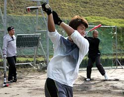 初対面・ジャンもビビッた!金本、初打ちで闘魂30スイング!金本が今季初打ち。その闘魂30スイングでジャンの視線を奪ったジャン(手前)が金本と初対面。アニキのことは知っていた アニキの初打ちにジャンもビビッた! 阪神・金本知憲外野手(38)が29日、甲子園球場新室内練習場で今年初めてフリー打撃を敢行した。闘魂30スイングに「初めてにしてはいい」と好感触。その鋭い打球音に初対面した新外国人、エステバン・ジャン投手(31)も仰天し、巨体をすぼめて「すごい打者だと聞いている」と舌を巻いた。◇ 初対面はアニキの迫力勝ちだった。甲子園新室内での自主トレで金本とジャンが競演。別々に汗を流していても自然と相手を目で追った。猛虎の4番の初打ちは、1メートル93&116キロの巨漢を動けなくした。 「初めてにしてはいいな。サク越え3発はいったか(笑)。今は自分のペースでやれているからいいけど、キャンプになれば疲れも出る。まだ動きはそうでもないよ」 金本はティー打撃で体を十分ほぐした後、多田打撃投手を相手に闘魂30スイング。ネットが張ってあるだけに実際の「サク越え」はない。目慣らしの段階ではあるが、冗舌なのは打球音に確信があるからだろう。当初は初打ちの予定はなかったが、結果的に新助っ投に猛打、驚打を見せつける結果になった。 「彼が4番打者で、すごいバッターだと聞いている。(自身の勝利に)貢献してくれるとしたら素晴らしいことだね」 ジャンは金本を知っていた。日本球界の現役最高俸5億5000万円を稼ぐ男。あいさつに走り笑顔で握手こそ交わしたが、練習に入ると近づくことができなかった。フリー打撃が始まると、ひざを折り、ネットにへばりついて食い入った。今季の虎を占う“投打の顔”。密室空間には異様なムードが漂った。 キャンプインを目前に控え、金本の体調が上がっていることは間違いない。17日に広島でのウエートトレをいったん打ち上げたが、27日に再びトレーニグジム「アスリート」にUターンした。 鉄人といえども年齢的な衰えはある。スクワットの数値などが年々微減傾向にあったが、「もう一度、記録を出したいと戻ってきた。コンディションがいい証拠だろう」と同ジムの平岡洋二社長(50)。4月3日で39歳になるが「年だから」で折り合いをつけることがない。その姿勢がジャンをも圧倒した。 ドミニカンにも肌で分からせた威圧感。アニキは早くも戦闘態勢だ。07年モデルはメジャーええとこ取り!今岡、新バット完成間近!バット選びも佳境に入った今岡 “名刀探し”の旅の終着駅が見えた。阪神・今岡誠内野手(32)が29日、沖縄・宜野座での合同自主トレに合流。今年初の屋外フリー打撃で、米大リーグの首位打者、ツインズのジョー・マウアー捕手(23)のバットがモデルの新タイプの感触を確認した。新たに3タイプを発注し、宜野座キャンプ第1クールで“相棒”を決める。◇ 07年今岡モデルが完成間近。一昨年の打点王が、プロ入り後、初めて行った大改造。選び抜いた1本で復活への道を切り開く。 「この時期は、バッティングの質はいいんでね。バットの感触だけを意識していた。自分が感じたことを担当者に伝えたよ。もう1回、修正をかける」 宜野座合同自主トレに参加。守備練習を終えると、先頭で今季初のフリー打撃を行った。1球1球、ミートポイントを確かめながら35スイング。その後、契約するローリング社の担当を呼び寄せ、修正点を伝えた。 昨年12月に4年ぶりに同社のバット工場を訪問。ばね指の手術を受けた右手中指への負担を軽減する“手にやさしいバット”へのモデルチェンジを決定した。年明けの自主トレで3タイプを試し、今回は従来型と昨年のア・リーグ首位打者、マウアー・モデルのグリップエンドが大きいタイプを持参した。だが、「まだ自分が目指している形じゃない」と、3タイプを新たに発注する。 「長さが気になったようなので、0.5インチ短くした33.5インチ(85センチ)のものになる。今ある2種類のほかに、スイートポイントが比較的広いハンター(ツインズ)モデルも加えます」と担当者。微調整を重ねた5本択一で、キャンプ第1クールに最終テストを行う。2・8に予定されている紅白戦は、ニューモデルで出陣する。 「バッティングは、キャンプに入ってから徐々にあげていくよ」 腕に覚えはある。厳選した名刀を手にしたとき、逆襲の舞台の幕が開ける。■今岡のバット ★従来型 長さ34インチ(86センチ)、重さ890グラム前後を基準に、微調整を行う。今年は少し重めの900グラム前後に設定している ★マウアー型 昨年、イチロー(マリナーズ)を抑え、捕手としてア・リーグ史上初の首位打者(打率.347)に輝いたマウアー(ツインズ)のバットは、グリップエンドが大きいのが特徴。右手への負担軽減のため、グリップ&グリップエンドを大きくしたい思惑に合致した ★ハンター型 守備の名手として6度ゴールデングラブ賞を受賞しているハンター(ツインズ)のバットは、スイートポイントが比較的広く、グリッ