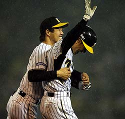 2007年4月24日(火) 対ヤクルト 3回戦 甲子園 阪神2×1ヤクルト4 所載はこちらをクリック 林救った矢野決めた!九死に1勝、雨中の逆転サヨナラや!同点に追いついた九回、サヨナラ打した矢野は背後から抱きつかれ、夢心地だ (セ・リーグ、阪神2x-1ヤクルト、3回戦、阪神2勝1敗、24日、甲子園)九ごっちゃんサヨナラで猛虎が九死に一生を得た。借金暮らしとも2日でオサラバだ。強まった雨が1点を追う九回に敵失を呼び込み、一死満塁から林威助外野手(28)が起死回生の同点打、最後は矢野輝弘捕手(38)が中前打にはじき返して、幕切れを彩った。これで乗らな、ウソやで!!◇ 雨のドラマに2人の主役が存在した。1点を追う九回。林の千金打で追いつき、矢野が一気にトドメを刺した。したたる水滴が心地いい。雨音に負けじと、お立ち台から正妻の声が弾んだ。九回、一死満塁で林はヤクルト・高津から右前に同点タイムリー続く矢野は中前にはじき返して決着をつける 「若い狩野も頑張っていますが、オジさんの矢野も負けませんっ!!」 一死後、シーツの飛球を右翼手・ガイエルがまさかの落球。守護神・高津の動揺にもつけ込んだ。矢野の殊勲打は同点に追いついた直後、一死満塁で飛び出した。3球目スライダーがエジキだ。打球は前進守備を突き破って中前へ。三走・金本が小躍りして生還した。 さきの巨人3連戦。一番弟子の狩野が3連夜の爆発を演じた。「自分の若い頃を思い出した。チーム内に競争があるほうがいい」。安泰の座に刺激はない。下からの突き上げがまた、選手としての延命につながる。ならば同点打の林はどうか。 右肩痛を再発させた浜中が、23日に登録抹消。右翼を争ったライバルが姿を消した。今季7度目の先発だが、相手先発が左腕では初めてだった。 「左投手にも苦手意識はない」。その思いは空転した。左腕・石川に2打席凡退。ところが今季4度目の完封負けが迫った九回、シナリオが書き替わった。失策、敬遠、四球で塁上が埋まった。 「最低でも外野フライを打とうと思っていました。それまでヒットを打てていなかったから。きょうからは責任を持ってやらないといけない」 打球が水しぶきを上げながら、右翼手・ガイエルの手前ではねた。勝負を決定付けた瞬間だ。 若手と見られるが、実は浜中と同学年の28歳。独身選手寮の虎風荘では最年長の住人だ。「練習に専念したいから」と結婚するまで出るつもりはない。大卒ならば入団2年が退寮のメドとなっている。今季5年目。球団関係者は言う。「台湾のお母さんに送金していることなど、彼の事情も考慮している」。運を呼び込む素地がある。 掛布、新庄。かつてのビッグネームも主力の欠場を機にスターダムにのし上がった。果たして同じ星に棲む男なのか? 「右ピッチャーで、一番おいしいところで回ってきたな」 岡田監督も“見えない力”にピンときた。雨中の5割復帰。虎にもまだまだツキがある。一生に一度のチャンス。林が強運&強打でそれをもぎ取る。男気『0』封!“禁”破り久保田&ウィリアムス緊急登板!七回に登板した久保田は2イニングをゼロ封ウィリアムスは逆転サヨナラの影の立役者だ (セ・リーグ、阪神2x-1ヤクルト、3回戦、阪神2勝1敗、24日、甲子園)雨雲がまるで鉛のように絡みついていた。『0』が並び、1点を追う重苦しい展開。負ければ今季初の3連敗に土壇場で、岡田監督の“攻めのタクト”が奇跡の逆転サヨナラ勝ちを呼び込んだ。 「間隔が空いていたし。後ろの3人がいるということは、逆転するということ。野手が最後に応えてくれた」 好投のジャンが、顔面に打球を受けて突如の降板。七回無死一塁。想定外の窮地に迷わず、久保田を緊急登板させた。二死から武内を四球で歩かせたものの、田中浩を二飛で後続を断つ。続く八回は3人斬りだ。 そして“禁”を破った。1点差とはいえ、負けている展開で初めてウィリアムスをコール。そして青木、ラミレス、ガイエルの主軸をピシャリ。『JK』、いや『F』まで出してでも踏ん張り、勝ちをもぎ取ろうとする執念。描いたシナリオが、最後に結実した。 21日の巨人戦(甲子園)。1点ビハインドの七回に久保田を投入しながら、八回の相木が2失点。『JF』を温存して敗れた。「五回、六回でリードした展開にならん。4試合先制されて、後手後手になる」。リードできなければ、必勝パターンもつかえない。もどかしい中、勝負手を打った。そして貴重な白星をもぎ取った。 初勝利のおまけもついたウィリアムスも「うれしい」と笑顔をみせたが、「心配。早く直ってほしい」と負傷したジャンの症状を気遣った。 「最後まで何が起きるかわからんけど、もっと早い回に点を取らないと。まだ全開とはいかない」。将に満面の笑みはない。まだ打線は本調子じゃない。それが牙を剥くまで、我慢の采配で乗り切る。