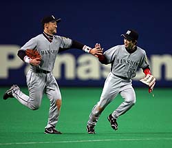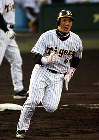 2007年4月18日(水) 対中日 5回戦 ナゴヤドーム 阪神9×1中日4 所載はこちらをクリック 虎9得点&先発全員安打!“鬼門”ナゴヤドームの呪い解けた!ナゴヤドームで今季初勝利や! スタメン復帰した赤星(右)はゲームセットの瞬間、金本と笑顔でハイタッチ (セ・リーグ、中日1-9阪神、5回戦、阪神3勝1敗1分、18日、ナゴヤドーム)阪神が敵地ナゴヤドームで竜に大、大、大完勝だ! 首を痛めていた赤星憲広外野手(31)がスタメン復帰するや、初回に6得点の秒殺劇。鬼門と言われた尾張の地で、呪縛を解き放つ先発全員安打。鬼門打破の虎祭りやで!!◇ さあ、尾張に集う虎党よ!! 腹の底から声を出せ!! 今までたまった分だけ、六甲おろしを歌おうやないか!! 屈辱を味わい続けた鬼門の歴史に、猛虎が力強くピリオドを打ったんやから!! 「犠牲フライで1点取った後に、あれだけ続いたんやから。5、6番が打つと大量点? いつも言うてることやんか」 岡田監督も大きく目をむくほどの秒殺劇だ。先頭・鳥谷が先発・長峰の初球を左前への進軍ラッパを吹いた。4試合ぶりに『2番・中堅』で先発復帰した赤星が投前へ犠打をきっちり。頚椎椎間板ヘルニアを患い、左半身にはしびれがあるが「気合を入れてやるだけ」。アドレナリンでかき消していた。 金本の犠飛で先制すると、2四球をはさんで5番・今岡から5連打。二死満塁で、再び手負いの選手会長に打席が回ってきた。一塁左への痛烈なゴロを放つと全力疾走。適時内野安打となり、スコアボードの左上に『6』を点灯させた。 「抜けると思ったのに。仕事を果たせてよかった」と安どの表情の赤星だが、ナゴヤドームでの初回6点は7年ぶり2度目の最多タイ。7試合ぶり開幕オーダーに戻った打線が、うれしいほどの連鎖反応を起こした。 前日は3安打完封負けの屈辱。できれば休ませたかった赤星を、指揮官は敢えて代打で使った。「『あした行けよ』という監督からのサインと思っていた」。実際にスタメンが決まったのはこの日の練習前。あ・うんの呼吸がそこにあった。その期待に応えてみせた。 昨季1勝10敗。前日まで通算33勝86敗1分け。まるで呪われたかのような鬼門の地だが、対策が功を奏した。「打席から投手が近くに見える」ということから、試合前の練習では将のアイデアで打撃投手を約1メートル前から、投げさせていた。 「1点取られた後に、1点でも入ればというところで、3点は大きかった」。四回の金本の3ランを呼び込んだ赤星の左前打を評価。ここでの9得点も04年4月20日以来、3年ぶりの大勝だ。 「きょうはせっかく勝ったんで、あしたもがんばります」と地元出身のレッドスターが気勢を上げる。 今季最多タイ13安打&先発全員安打による鬼門勝ち越しという最高のナゴヤ土産で、次は甲子園でも、ドンチャン騒ぎといきましょか。金本が自己最速7号!ウッズに1差、「4番」対決も勝つで!四回にはトドメの3ランを右翼席へ運んだ (セ・リーグ、中日1-9阪神、5回戦、阪神3勝1敗1分、18日、ナゴヤドーム)難攻不落の敵陣で、先制パンチ&トドメの一発。役者が違う。4番・金本が自己最速ペースを更新する7号3ランで、鬼門初星を呼びこんだ。◇ 「どうしても、追加点がほしかった。右方向に打って、ランナーが三塁にいけばと思った」 進めるどころか、歩いて迎え入れた。5点リードの四回だ。赤星、シーツの連打で無死一、二塁。つなぎの意識で打席に入った。カウント0-2から2番手・浅尾が投じた3球目、真ん中に入ってきたスライダーを振り抜いた。「あんまりいい打ち方じゃなかった」。それでも、高々と舞い上がった白球は右翼席でポーンと跳ねた。初回の猛攻で一息つき、1点を返された場面。取り戻しかけた竜の戦意を完全に奪った。二回、懸命に走って内野安打を決めた金本 3・30開幕戦以後続いていた胸のつかえが、ようやく取れた。開幕敗戦直後の一塁ベンチ。「きょうはすまなかった」。肩を落としてロッカーへと引きあげるナインに向かって、下柳がわびた。同級生のそんな姿が、ずっと脳裏に焼き付いていた。敗れた責任は4打数無安打だった自分も同じ。もうアイツにあんな思いはさせたくない-。だが、次の登板の巨人戦(6日・東京ドーム)でも援護できず、計8凡退。3度目の正直にかけていた。 開幕直前に痛めた左太もも裏はまだ万全ではない。名古屋遠征からアップに合流したが、シートノックは回避。体と相談しながら戦う日々だ。 初回は一死一、三塁で先制の右犠飛を放った。今季3度目の1試合4打点。完封負けを喫した前日17日の第1戦は、中日・ウッズが1本塁打3打点。「(中日に)昨年は4番の差で負けた」と振り返る主砲対決は、これで五分だ。 「去年は去年、今年は今年。去年みたいな重い気持ちはない。(ナゴヤドームに)苦手意識はない」 敵地でのヒーローインタビューで言いきった。トイメン勝負を制し、今宵も尾張に六甲おろしを響かせる。下柳ようやく初勝利!中11日も“いたずら調整”で問題なし!先発の下柳は5回を1失点でしのぎ、今季初勝利だ (セ
