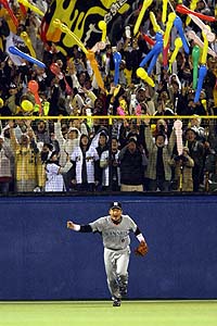 2007年4月3日(火) 対ヤクルト 1回戦 神宮 阪神4×3ヤクルト4 所載はこちらをクリック 金本39歳バースデー満塁弾!虎3連勝や首位タイや!ゲームセットの瞬間、ガッツポーズで駆け出す金本 (セ・リーグ、ヤクルト3-4阪神、1回戦、阪神1勝、3日、神宮)阪神・金本知憲外野手がバースデー・グランドスラム。3日のヤクルト戦(神宮)で、39回目の誕生日を自ら祝う2号満塁弾。守っても同点危機を救うバックホームで、4-3勝利、3連勝を虎党にプレゼント。あ~、もう、アニキからは、感動、もらいっぱなし。今度、お返しさせてもらいま~す!!◇ 塁上に灯る3本のろうそくを、アニキが豪快にひと息で吹き消した。39度目の誕生日を、金本が自ら、ド派手なグランドスラムで祝う。神宮の夜空に放物線を描いた白球はバックスリーンで『ゴーン』と轟音を響かせた。39歳のバースデー。アニキは打撃&守備で魅せた 「満塁だったんで、ひたすら甘い球だけを待っていました。ホームランじゃなくても、先制点が欲しかった。結果的にホームランになってよかった」 2年前にもバースデーアーチを放った同じ左腕・石川からだ。五回一死後、ジャンが内野安打。赤星、シーツの連打で作った二死満塁。カウント1-3から、真ん中高めのカットボールをガツン。2試合ぶりの今季2号は、昨年8月6日の広島戦(松山)以来となる通算6本目の満塁アーチだ。 肩でも魅せる。4-3のの八回二死二塁。福川の打球は右前へ転がる。金本は鬼の形相で本塁へ2バウンド返球。同級生の矢野とのホットラインで同点を阻止。「ちょっと投げるのが遅れた。濡れた人工芝のスピンを利用した」と、瞬間的に冷静な判断を働かせていた。 年を重ねてなお、心・技・体を兼ね備える鉄人に、首脳陣は絶大な信頼を寄せる。3月6日のソフトバンク戦(ヤフードーム)の試合後、岡田監督は浜中に強制帰阪を告げた。極度の不振で甲子園での打ち込みを厳命した。直後、正田打撃コーチは携帯電話で『金本知憲』のメモリーを押した。 「なあ、カネ。浜中がおかしいんや。お前が手本を見せて、悪いところがあったら言うたってくれ」。苦しむ浜中の復活を手助けしてほしい。開幕に照準を絞って甲子園に居残るベテランに、コーチが“越権行為”を認めた。チームリーダーというだけではない。プレイングコーチ的な立場としても、チームの屋台骨を支えている。 不敗神話も継続。阪神に移籍後、誕生日は5年間負けなし。満塁弾を打った4試合も同じ。チームも3連勝で巨人、中日に並び今季初の首位だ。 「このトシになるとな…、もう39歳です。年齢以上の本塁打? もう1回40本を打ちたい。きょうからの関東6連戦、甲子園に負けないノリノリの応援をお願いします!!」 敵地のヒーローインタビュー。背番号6に祝福の声が止まない。通算2000安打へあと150。400本塁打にもあと35。挑戦への鉄人の歩みは、年齢と対照的に加速している。★チタンの鎧が来る! アニキがプロデュースした通称『チタンの鎧(よろい)』が4日にも手元に届けられる。今年1月に「遠赤外線の出るリハビリ器具をチタン素材で作れないか」と契約するファイテン社にリクエスト。岐阜県内の製作所で類似品を作っていることが判明し、さらに改良を加えた。 柔らかいチタンで各部位に巻くタイプで、遠赤外線で温熱効果が得られる。関係者は「痛めている左太ももにも巻きつけて使用できる」と話し、回復の秘密兵器となる。■データBox 阪神・金本の満塁本塁打は昨年8月6日の広島戦(松山)以来通算6本目。広島時代に2本、阪神では4本目。満塁弾を放った試合はすべてチームが勝っている。セ・リーグの現役選手では中日・中村紀が13本放っているが、すべてパ・リーグ時代に記録したもの。これを除けば金本の6本は、8本の中日・ウッズ、7本の巨人・高橋由ら4人に次ぐ。★同点ピンチ、矢野が救った!矢野が八回、金本のバックホームをがっちりつかみ、二走ガイエルをブロック。同級生の気迫の“リレー”だった 矢野が懸命のブロックでジャンの初白星を守った。八回二死二塁、左前打で二走ガイエルは本塁突入。金本からの送球を本塁前で待ち構え、捕球後に体当たりを食らったが、本塁を死守。同点を阻止した。 「必死やったわ。雨でボールもよく滑るし。体で止めにいったわ」 連続安打は3でストップしたが、守備の要として貢献度、大だった。またまた盤石0封ショー!「KJF」で“快汗”3連勝や!球児が九回に仁王立ち。久保田、ウィリアムスから託されたバトンは、3試合連続で成功 (セ・リーグ、ヤクルト3-4阪神、1回戦、阪神1勝、3日、神宮)この並び順も3連投で板に付いた。KからJにつなぎ、Fが締める。1点リードの危ない橋を、バトンをつないで渡り切った。小雨が降り注ぐ最終回、気温は10度を切っていた。寒気のマウンドに球児が仁王立ちだ。◇ 「金本さんの誕生日だったんでね。(寒かったが)きょう出せる100%を出そうと思った。このカードが大切。負けたら5割に戻るんで勢いに乗るところだと思った」 先頭の代打・