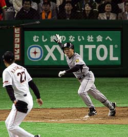 2007年4月7日(土) 対巨人 2回戦 東京ドーム 阪神4×3巨人バンザ~イ\( ^O^ )/ バンザ~イ\( ^O^ )/4 所載はこちらをクリック ワッショイG倒!林が爆発3打点!初スタメンいきなり大仕事!二回にアーチをかけた林。バットを放り投げる姿が美しい林を出迎える阪神ベンチ。この一発で沸き返った (セ・リーグ、巨人3-4阪神、2回戦、1勝1敗、7日、東京ドーム)阪神・林威助(リン・ウェイツゥ)外野手(28)が7日の巨人戦(東京ドーム)で不振の浜中に代わり今季初スタメン。1号アーチと2点タイムリーで4-3の勝利を呼び、虎を借金危機から救った。岡田監督の決断に、まさに一発回答。打線もこれで目が覚めたやろ!!◇ 敵地にこだまする六甲おろし。勝利のハーモニーのタクトを振るったのは、今季初スタメンに燃えた林だ。反撃のノロシとなる今季第1号に、勝ち越しタイムリー。“最強の控え”と称される大砲が、大爆発だ。 「とにかく、必死に打席に立った。チャンスをもらったときに、アピールしていかないといけないんで」 打撃不振の浜中に代わって6番・右翼。出番に飢えた男が2点を追う二回一死、獲物に襲いかかった。カウント1-2からの4球目、門倉の140キロ直球を振り抜いた。「ちょっとつまった」が、持ち前のパワーが勝った。右中間席中段に突き刺さる一撃で、チグハグな打線にカツをいれた。 浜中との右翼レギュラー争いに敗れ、開幕はベンチスタート。母・張鳳嬌さん(56)を招待する2年越しの夢は、叶わなかった。「また今度できればいいね」。悔しさを押し殺し、3月30日、開幕を迎えた。代打で計4打数2安打と結果を残し、7試合目でようやく得たチャンス。1本だけでは満足できない。 三回、金本の中犠飛で同点に追いついてなお二死二、三塁。再び牙をむいた。内角をえぐる初球に軽く身を翻すと、続く外角スライダーを踏み込んで捕らえた。「変化球を狙ってなかったけど、自分のタイミングで打てた」。中前に鋭く抜ける2点打で計3打点。門倉をKOに追い込んだ。 試合前のフリー打撃で重いマスコットバットを手にするようになった。「体のバランスを意識しながら、スイングをチェックできるからね」。これまでは「試合の感覚で練習したいし、何より、練習から遠くに飛ばして、アピールしないといけないからね」と試合用バットを使っていた。マスコットバットでも、飛距離は変わらない。「ちょっと、林ちゃん」。この日も看板直撃弾を連発する背番号31に、順番を待つ金本が驚嘆したほど。力を見せる場から技術を磨く場へ。アプローチの変化が、進化を支える。 「本当は、雨のとき(4日のヤクルト戦)もスタメンやった」と岡田監督も、連敗を2で止めた孝行息子に目を細めた。 宿敵を倒して、再び2位に浮上。前を走る竜とのゲーム差を1.5に縮めた。 「代打のときと同じ気持ちで、1打席を集中してやっていきたい」 1球たりともムダにはしない。勝利の使者・林はまだまだ飢えている。★浜中は代打で併殺打! ライバルにスタメンを譲った浜中は、六回一死一塁で代打に登場。野口のスライダーを引っかけ、遊ゴロ併殺打に倒れた。「考えすぎるとよくないと思うんで、自分はいいんだ、と言い聞かせて打席に向かっているんですけどね」。前日は11打席ぶりの安打を右前に放ち、試合前には岡田監督から直接指導を受けたが、まだ辛抱のときは続きそうだ。球児“仁王立ち”4セーブ!「見ている人に感動を与えたかった」!1回2/3をピシャリ。球児が打者6人に対して仁王立ちした (セ・リーグ、巨人3-4阪神、2回戦、1勝1敗、7日、東京ドーム)渾身の27球だった。白球に気持ちを乗せた。藤川球児が絶体絶命のマウンドで仁王立ちだ。◇ 「見ている人に感動を与えたかった。(この緊張感は)自分しか味わえない。ゲームを超えて幸せなことです。苦労したとは思っていない。それが仕事ですから」 1回2/3、打者6人を相手に1安打2三振。今季4セーブ目をつかんだ。 1点リードの八回一死三塁。外野フライも許されない窮地で、マウンドを任された。狙うは三振のみ。全球、直球勝負しかなかった。迎えるバッターはホリンズ。カウント2-2からの6球目、内角高めへ投じた“火の玉”は、この日のMAX150キロ。完全につまらせ一邪飛。続く代打・矢野は2球で追い込み、最後は148キロで空振り三振に仕留めた。 九回、小笠原の中前打で迎えた二死一塁。一発逆転の場面で、4番・李承ヨプを中飛に打ち取ったのはカーブだった。それでも、わずか4球の変化球を悔やんだ。 「できる範囲で直球勝負する。やることはやったけど、最後まで自分の力で終わらせたかった」 直球にかける思いがある。昨年8月、右肩を痛めた際に変化球主体の投球に切り替えた。その直後から、周囲の厳しい声が耳に入った。 「なぜ直球勝負しない」「変化球を打たれてるのに」 苦しかった。自身が映るテレビ録画は、音量を「0」にして見ていた。解説者の声も遮りたかった。だからこそ万全の状態の今季は、最高の直球でファンを魅了したい。 「三振が取れるからな