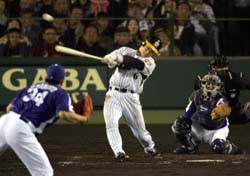 2007年4月26日(木) 対ヤクルト 5回戦 甲子園 阪神3×1ヤクルト4 所載はこちらをクリック 金本&シーツ打点揃い踏み!今季初の同一カード3連勝や!金本は一回二死一塁で、中越えの適時二塁打 (セ・リーグ、阪神3-1ヤクルト、5回戦、阪神4勝1敗、26日、甲子園)阪神のアンディー・シーツ内野手(35)と金本知憲外野手(39)の3、4番コンビが今季2度目の打点揃い踏み。ヤクルト相手に今季初の同一カード3連勝を飾り、単独3位に浮上。いよいよ始まるゴールデンウイーク9連戦。主役が揃えば、ガッポリ貯金週間にしまっせ!!◇ 猛虎に勝負強さが戻った。主軸が打てば、チームは負けない。今季初の同一カード3連勝。3万8038人の虎党が、3夜連続の六甲おろしを大合唱だ。音頭を取ったのは、頼れる2人のバットマン。シーツ、金本の3、4番が、至福のハーモニーを奏でた。 「あれはタイムリーといわんよ。次の打席で打ってたらタイムリーやけどな」 勝利の凱歌を背に金本は、アニキ節で振り返った。一回、痛烈な先制パンチを見舞った。赤星のセーフティーバントを足がかりにした二死一塁。カウント2-2からグライシンガーが投じた5球目、高めのスライダーを振り抜いた。アッという間に中堅の頭上を越える弾丸ライナーの適時二塁打。7試合ぶりの打点で二塁ベースに仁王立ち。その背中は頼もしかった。それでも、続く三回一死二、三塁での空振り三振を主砲は悔いた。気力が充実している証しだ。 鉄人が放つパワーには、オフに護摩行を行う鹿児島・最福寺の池口恵観法主(70)が舌を巻くほどだ。「開幕から一息ついて疲れがくるころだろうと思って、14日に話をしたんです。こちらから気をおくったんですが、はね返ってくるものが今年は違う」。携帯電話を通じて感じる力に活躍を確信した。シーツは三回、二塁へヘッドスライディングの気迫を見せた その気迫は、前を打つシーツにも乗り移った。三回一死一、二塁。開幕から31イニング目で、初めて四球を与えた助っ人右腕のスキを見逃さなかった。チェンジアップに食らいつき、三遊間をしぶとく破った。「いい場面で打てて本当によかったよ。接戦の大事な展開の中で打てたのは自信になる」。華麗な守備でもみせた。四回二死満塁、宮本が放った一、二塁間の打球を好捕。「むちゃくちゃ難しいプレーじゃないし、普通にやっただけだよ」とクールに振り返る。 3、4番の揃い踏み打点は、4月11日の中日戦(甲子園)以来、2度目。第1戦のサヨナラ勝ちで勢いを付け、前日25日は5番・今岡が4安打1打点と復調をアピールした。チグハグさが目立った打線が、勝利のコツをつかみ始めた。先発のグライシンガーにはオープン戦で4回0封に抑えられていた。「あのときは点が入らん感じやったけど、序盤で点が取れてよかった」と岡田監督は復調気配を感じ取った。 「遠征に出ても勝ってくるんで、応援よろしくお願いします」。お立ち台で、シーツが力強く叫んだ。今季2度目の3連勝で、3位に浮上。貯金も最多タイの2とした。28日からはGWの9連戦を前に、上昇気流に乗った虎が連勝街道を突き進む。美人妻観戦したら負ケマヘン!ボーグルソンなんとか2勝目!5回を1失点でしのいだボーグルソン。2勝目を挙げた (セ・リーグ、阪神3-1ヤクルト、5回戦、阪神4勝1敗、26日、甲子園)最後まで綱渡りの投球でもがき苦しんだ。与四球は「4」、球数も5回で102球まで達した。ボーグルソンが守備陣の援護で何とかつかんだ2勝目。愛妻の前で、ダンナのメンツはかろうじて保った。 「ディフェンスが素晴らしい仕事をしてくれた。きょうは振り返っても良くなかったけど、ディフェンスがすべてやってくれた」 一塁ベンチ上の観客席にはニコール夫人がいた。情けない姿は見せられない。だが、野手の助けがなければ5回1失点では済まない内容だった。 四回二死満塁の危機では宮本に痛打された打球を、シーツが懸命に横っ飛びして捕球。一ゴロで窮地を脱した。1点を失った五回は、なおも二死一、二塁の危機から福川に高めのカーブをとらえられた。中前に抜けそうな痛烈な打球を鳥谷が果敢にダイビングキャッチして遊ゴロ。バックのおかげで大量失点をかろうじて免れた。 前回19日の中日戦(ナゴヤD)では五回に突如乱れて計6失点。「自分を見失った」と振り返った。翌日、練習中の下柳に通訳なしで英語で話しかけた。「どうしたらピンチで冷静に投げれるか」。経験豊富な左腕に助言を求めた。結局は通訳を挟んだが、頼りになるベテランからは明確な答えが返ってきた。「矢野のサインに首を振り過ぎ。もっと矢野を信じて、ミットに投げ込むだけでいい」。教えを忠実に守り、この日はほとんど首を振らなかった。「前よりよかったんちゃう」と矢野。信頼関係はこれで一段と深くなった。 岡田監督は「あっぷあっぷやった。コントロールが悪い。五回で100球やろ。好調なチームなら二、三回でつかまっとる」と酷評。それでも勝ち星を手にすることができたのは大きな収穫だ。 「試合には勝った
