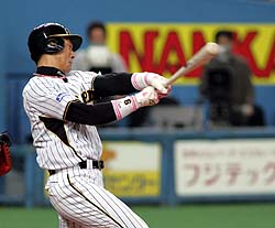 2007年4月12日(木) 対中日 3回戦 甲子園 阪神3×1中日バンザ~イ\( ^O^ )/ バンザ~イ\( ^O^ )/4 所載はこちらをクリック ボーグルソン愛の驚弾!竜倒に虎党も美人妻もバンザ~イ!ボーグルソンは二回、甲子園初打席で左翼へ2ランの驚弾 (セ・リーグ、阪神3-1中日、3回戦、阪神2勝1分、12日、甲子園)仰天の一撃でボギーが竜倒だ!! 阪神はライアン・ボーグルソン投手(29)が甲子園初打席で中日のエース川上から左翼へ2ラン。驚愕の弾道で勝負を決めた。投げては6回1失点と、美人妻のニコールさん(28)が見守る中、首位中日に0.5差に迫るハッスル白星や!◇ 甲子園を震撼させる一撃だ。先発投手のボーグルソンが甲子園初打席で虎党を仰天させる110メートル弾を放った。 「甲子園のファンは世界一だと思っている。こういうファンの中でやるのは初めて。最高の気分だ。あの瞬間、自分にとっては忘れられない瞬間だった」打つだけじゃない!ボーグルソン投げては6回1失点 1点リードの二回二死二塁。カウント1-1から、竜のエース川上が投じた内角への143キロの直球を投手とは思えない鋭敏なスイングで振り抜き、打ち砕いた。カッツタウン州立大時代は三塁手で、メジャー通算は59打数11安打(打率.186)。打撃能力は本物だ。高らかに舞い上がった打球は、華麗な放物線を描いて左翼席中段に突き刺さった。99年のミラー以来となる外国人投手による驚弾は、一振りで虎党の心をつかむ2ラン。甲子園はボギー劇場と化した。 じっくりと歓声を堪能してから本塁を踏むと、一塁ベンチ上に向かって左手人さし指を高く突き上げた。その先には同じポーズを取ったニコール夫人の姿があった。 自宅を出発する直前のことだった。妻は本拠地初登板の晴れ舞台へと向かう夫を呼び止めた。「きょうは良いピッチングと、私のためにホームランを打ってね」。冗談交じりの言葉だった。だが、その言葉には確かな力が宿っていた。 「不安なことはいつもワイフに相談しているんだ」。支えてくれる人がいるからこそ、異国での挑戦にも決心がついた。感謝の思いを込めて、完ぺきな演出を用意した。これ以上のプレゼントは世界中を探しても見つからない。「アイラブユー」。4万1228人の大観衆の前で、愛を叫んだ。 本業の投球では6回を投げて4安打1失点。5四球で制球に苦しんだものの、来日最速150キロもマーク。失点は六回無死で中村紀に許した一発だけだ。「ウイニングボールは他の(記念)ボールと一緒に、家で大事にしたい。意味のあるボールだよ」。独壇場の奮闘で、堂々と来日初白星もつかんだ。 「打撃がええのはわかってたけど、あそこまでええとは思わんかったな。中日戦の最初で良いスタートが切れた」 岡田監督も思わぬ誤算にニンマリだ。今季初の甲子園決戦で憎き落合竜に負けなしの2勝1分け。ゲーム差は0.5まで詰め寄った。中日との初カードで黒星なしは88年以来19年ぶりの快挙。すでに2勝を挙げたジャンとともに助っ投の両輪がV奪回への道のりを駆けていく。応援にかけつけたニコール夫人に来日初勝利をプレゼントだ★美人妻ニコールさん大興奮! ジョークが現実になるなんて…。ニコール夫人はネット裏から夫の大立ち回りを見届けた。“約束”通りの竜倒弾。バンザイした後、夫に向けて左手人さし指を突き立てた。 「ここに来ることが楽しみで、とても興奮しています。彼はバッティングを愛しているの!!」 歓喜のお立ち台後、1メートル85の長身が、さらに6センチ高いダンナ様に寄り添った。米国ではモデル経験あり。阪神電鉄のテレビCMにも抜てきされた美人妻だ。 本塁打を放った選手にはマスコット「トラッキー」のぬいぐるみが手渡される。ボギーは一塁側のファンに投げ入れたが、それが善意で奥様に届いた。一生に一度。忘れられない夜になった。■データBox 阪神先発のボーグルソンが二回、中日・川上から本塁打を放った。阪神投手の本塁打は04年5月13日(巨人戦、東京ドーム)の福原以来。 甲子園球場で投手の本塁打は昨年6月9日に西武・松坂大輔(現レッドソックス)が放っているが、阪神の投手では88年4月26日(大洋戦)にキーオが放って以来、19年ぶり。アニキ3試合連続打点!苦手・川上からも一撃、竜投カモや!一回二死二塁で、左中間へ適時2塁打を放った金本。中日戦3戦連続打点だ (セ・リーグ、阪神3-1中日、3回戦、阪神2勝1分、12日、甲子園)名勝負再び。今季の第1ラウンドは、最初の1球で勝負ありだ。『金本Vs川上』。第1打席、その初球が137キロカットボール。昨季苦しめられた軌道を、アニキの打棒が完ぺきに捕らえた。◇ 「川上の失投や。(ボールの勢いを問われて)前半はそうでもない。後半はよかったけどな」 初回二死二塁。いきなり竜のエースがひれ伏す先制二塁打だ。あわやフェンス越えの一撃。外角からストライクゾーンへ切れ込む必殺球を、左中間最深部まで運んだ。 川上の代名詞といえるカットボール。直球に近い球威で、スライダーのように横滑りする。リーグ制覇した05年の対戦成績は15打数8安