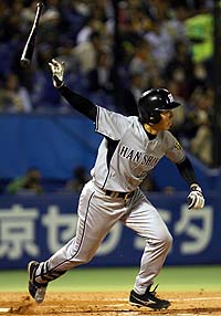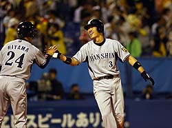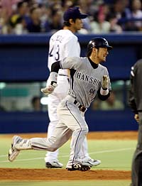 2007年5月12日(土) 対ヤクルト 7回戦 神宮 阪神3×2ヤクルト4 所載はこちらをクリック “超新星”の実力本物!狩野のリード&V打で虎3連勝や~!先制の一撃を左翼に放って二塁に到達する狩野 (セ・リーグ、ヤクルト2-3阪神、7回戦、阪神6勝1敗、12日、神宮)阪神・狩野恵輔捕手(24)が3試合連続スタメンで3連勝を呼んだ。二回の先制二塁打と必死のリードで、3-2の逃げ切りに成功。得点圏打率.571は中軸を凌駕。背番号99の勢いに乗って、9連敗を取り返す大型連勝が見えてきた。◇ 打ってよし、かぶってよし。東都の虎党が、狩野の攻守に酔いしれた。9連敗後の3連勝。敵地でまたも古田ヤクルトを転がした。流れを呼び込む先制打。リード面でも信頼度を増している。勝利のハイタッチも3夜連続なら、いよいよ板に付いてきた。 「バントのサインが出てないということは、打っていいんだと。思い切っていきました。(3連勝に)ホッとしてます。勝ててよかったです」鮮やかなバッティング。勝負強さはピカイチだ 捕手として絶対に与えたくない先制点。それを打者・狩野が力ずくで奪い取った。今岡、シーツの連打で作った二回無死一、二塁。ヤクルト先発・石井一のカットボールに食らいつき、左翼へ二塁打。得点圏打率は7打数4安打で驚異の「.571」。一過性の輝きではなく、これは実力だ。 3試合連続の先発マスク。連敗ストップからの再浮上は、背番号99がもたらした。好調な打撃、内角攻めをいとわないリードを買われての起用。それでも狩野にとって、矢野はまだ遠い存在だ。 今年1月、甲子園での矢野の自主トレに弟子入りした。事細かに技術的なアドバイスを受けたわけではない。「一軍キャンプに行ったら、絶対にランニングの先頭を走っとけ。絶対やぞ」。その言葉を大切にしていた。 2年前、狩野が初めて一軍キャンプに抜てきされたときから、矢野は後継者候補と見てきた。1年後、ランニングの隊列の後方を走る姿を見て、矢野は考えを変えた。一軍のベンチを奪い取ろうという姿ではなかった。狩野は昨年末の球団納会の席で「一緒に練習をさせてください」と頭を下げて来た。矢野はその心意気を受け止め、あえて技術に触れなかった。 先頭を走る。続ければまず、首脳陣の印象が変わる。使ってみたいと思わせる-。 狩野は、それを忠実に守った。その結果が初の開幕一軍。ブレークは“想定外”でも、出発点がなければ始まることはなかった。 「後ろの3人(JFK)については今まで受けた経験はなかったのに。毎日勉強して、いい方向にやればいいと思う」 岡田監督の口元にも信頼感がにじむ。先発マスク4連敗後の3連勝。チームは借金「4」の完済を目指すが、捕手としての収支は、13日にもとんとんだ。今季初の4連勝へ。超新星が虎のタクトを握っている。■データBox ★…岡田阪神では大型連敗後に連勝で取り返すケースが続いている。04年は8月14日の広島戦-20日のヤクルト戦で6連敗後、21日のヤクルト戦-29日の広島戦まで8連勝。05年は4月28日の中日戦-5月3日の広島戦で5連敗後、4日の広島戦から3連勝。06年は4月16日の広島戦-22日の巨人戦で5連敗後、23日の巨人戦から4連勝。8月22日の広島戦-26日の巨人戦で5連敗後、27日の巨人戦から1分けを挟んで6連勝した。鳥谷が千金タイムリー&美技!元“本拠地”で攻守にキラリ!鳥谷は四回に二盗。楽々セーフだった (セ・リーグ、ヤクルト2-3阪神、7回戦、阪神6勝1敗、12日、神宮)ここ一番で打つ。ここ一番で守る。これも、キーマンの証。攻守のターニングポイントで、1番・鳥谷が仁王立ちだ。 「何としても追加点が欲しかった。投手は1点(リード)じゃ苦しいと思うんで。会心(の当たり)ではないですが、打ててよかったです」 まずは『打』。二回に3連打、三回に2連打しながら、1点に終わっていた序盤。四回も一死二、三塁で9番・杉山が三振。「(二死からでも)トリ(鳥谷)かセキ(関本)でと思っていた」と、あえて“無策”で臨んだ岡田監督の期待に、結果で応えた。守っては七回、ライナーを好捕し併殺にとった四回の打席では貴重な2点タイムリー カウント1-1から左腕・石井一の外角140キロをとらえ、しぶとく中前に抜ける2点打。二死から放った2試合9打席ぶりの一打が、事実上の決勝打だった。 さらに『守』。1点リードの七回、ウィリアムスを投入しながら、二塁打と捕逸で一死三塁。JFKでの逃げ切りに暗雲が差した矢先に、飯原の強烈なライナーが頭上を襲った。「打った瞬間(三塁)走者が飛び出すのが見えた」。ジャンプ一番、打球をもぎとると、冷静に三塁へ送球。早大の同期・青木を刺した。 指揮官も「あの場面はもう同点(を覚悟)。打順は上位だし、ああなるとは思わなかった」と驚く併殺。あっという間のピンチ脱出劇だった。 七回には木田から、でん部直撃の死球というオマケ付き。まさに“大当たり”の1日に「当たったときは痛かったですが、今はポッポとしています」とニガ笑いだ。 神宮に詰めかけた観衆は今季最多の3万1272人。最近は早大・斎藤の登板