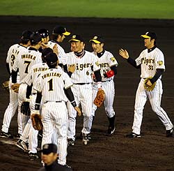 2007年5月13日(日)対ヤクルト 8回戦 神宮 阪神8×6ヤクルト4 所載はこちらをクリック 関本V打!野口がダメ押しタイムリー!脇役活躍で虎4連勝や!九回に野口の3点打で生還した関本(右)が桧山と喜びのハイタッチ (セ・リーグ、ヤクルト6-8阪神、8回戦、阪神7勝1敗、13日、神宮)阪神4連勝、この勢いは本物や!! 重苦しい展開を九回に関本健太郎内野手(28)、野口寿浩捕手(35)の連続タイムリーでヤクルトに執念の勝利。今季初の4連勝で、借金も「3」に減らした。次の広島3連戦(15日から米子、倉敷)で一気に借金完済や!!◇ 来た、来た、来たぞ。泥沼の先に連勝ロードが伸びていく。今季ワースト9連敗から今季最長の4連勝。4点リードを吐き出しても、徳俵に足をかけて踏ん張った。同点の九回、打線の再噴火で勝負を決めた。殊勲者は2人。今季いずれも苦しみ抜いた関本&野口だ。 「スローカーブは頭になかった。そればかり練習していたから。地味な練習が生きましたね。みんな連敗のウップンを晴らそうとしています」 一死から今岡の右前打で突破口を開き、シーツの三ゴロがイレギュラーして二塁打になる幸運もあった。ヤクルト守護神・高津は代打の桧山を敬遠する。塁が埋まった。打席には関本。5球目の92キロカーブを捕らえ、打球を左前で弾ませた。関本の勝ち越し打に続いて、野口が左越えへ走者一掃の二塁打。執念のひと振りだ トドメを刺したのは四回途中からマスクを被り、今季初出場を果たした野口だ。打球は左翼線を突き破り、3人の走者をすべてホームに迎え入れた。スコアボードに「4」が点灯する。脇を固める男たちが躍動した。 勝ち越し打の関本は、初の開幕スタメンを勝ち取りながら打撃絶不振に悩んだ。打率0割台に沈んだ4月上旬からは、試合前にスローボール打ちを続けてきた。「緩い球を打つことで自分のポイントを確認する」というのが狙いだった。それが実戦で生きるとは…。 野口はプロ18年目の開幕を二軍で迎えた。世代交代に押し出される屈辱だったが、「たとえ二軍でも開幕に合わせて調整するのがプロ」と言い切った。11日に初昇格したばかり。好投した橋本健は4月下旬に二軍落ちしており、「そのときいろいろ話をしていた」。耐えて忍んだ男と男がヒーローになる。追い風を感じずにはいられない。 「ああいう展開になると何かが起こる。きれいなヒットはいらん。どんな形でも1点を取りに行くというな」 試合後、岡田監督も背中に風を感じていた。9連敗の直前に3連勝しているヤクルトを再びたたきのめし、借金3。15日からはビジターの広島3連戦(米子、倉敷)が待つ。今度は魔のGW中に5戦全敗を喫した赤ヘルに借りを返す。 「ちょっと古い(表現だ)けど、リベンジしますっ!!」 勝者の行列の中で関本の声が弾んだ。逆襲あるのみ。借金完済へ猛虎が全員野球で走る。■データBox ★…岡田阪神では大型連敗後に連勝で取り返すケースが続いている。04年は8月14日の広島戦-20日のヤクルト戦で6連敗後、21日のヤクルト戦-29日の広島戦まで8連勝。05年は4月28日の中日戦-5月3日の広島戦で5連敗後、4日の広島戦から3連勝。06年は4月16日の広島戦-22日の巨人戦で5連敗後、23日の巨人戦から4連勝。8月22日の広島戦-26日の巨人戦で5連敗後、27日の巨人戦から1分けを挟んで6連勝した。効いたドーナツ差し入れ!シーツが“覚醒”3安打の大活躍!大活躍のシーツ。一回は3号2ランで今岡の先制打に続いた (セ・リーグ、ヤクルト6-8阪神、13日、神宮)その笑顔に、もう“悩める助っ人”の影など、ない。大歓声を浴びながら引き上げるシーツが、両手で捧げ持つ箱にかけていたタオルを、チラリとめくった。 「大好物の『クリスピークリーム』のドーナツだよ。試合前に正田コーチが差し入れしてくれたんだ。これが、きょうのラッキーアイテムだ」 実力と運。この試合のシーツには両方が備わっていた。まずは一回。今岡先制打の後、なお二死一塁から、グライシンガーの初球チェンジアップをとらえた。左翼席に飛び込む3号2ランは、12試合46打席ぶりの一発。ツバメの右腕に来日初被弾を見舞うと、同点の九回一死一塁では、三塁へ鋭いゴロを飛ばした。 最悪、併殺もあった打球は、飯原の手前で大きく跳ねて、ファウルグラウンドを転々。一死二、三塁と、決勝点のお膳立てをした幸運な二塁打で、23試合ぶり今季2度目の猛打賞も決めた。 9連敗中、ドン底の不振だった。5月8日の巨人戦(甲子園)で不動の3番から6番に“降格”すると、9、10日の同戦はスタメンも外れた。打率.225。やっと兆しが出たのが、この神宮だ。 7番で出場した11日の初戦。試合前フリー打撃で岡田監督、正田打撃コーチから「ヘッドがグリップより下がっている」とアドバイスを受けると、5試合ぶりの安打を含む2安打。6番の前日12日も1安打を放ち、迎えた3戦目。ラッキーアイテムも味方につけ、ついに打棒が“覚醒”した。 「全ての打席で完璧なパフォーマンスは見せられないけどね。ほぼ戻った。もう大丈夫だよ」 昨オフ、金本に習