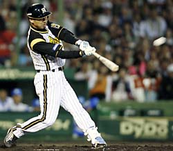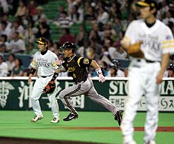 2007年5月23日(水)対ソフトバンク 2回戦 ヤフ-ド-ム 阪神3×1ソフトバンク4 所載はこちらをクリック 前夜のリベンジや!虎の師弟タッグ、金本&林がタカ撃墜!一回、左翼フェンス直撃の一撃を見舞った金本が疾走。主砲の力強い先制打 (交流戦、ソフトバンク1-3阪神、2回戦、1勝1敗、23日、ヤフードーム)金本&林、痛烈先制パンチや!! 阪神の金本知憲外野手(39)が一回、林威助外野手(28)が二回にそれぞれ適時打した。パ屈指の左腕、和田の初球を見事なワン・ツーパンチで、強敵・ソフトバンクから交流戦初白星。虎が進撃開始だ!!◇ 起きがけの速攻で、難敵・和田を転がした。狙いを定めた立ち上がり。金本の先制打でグラつかせ、すかさず林が追い打ちをかけた。パ界指折りのサウスポーを打ち砕いたのは、左打席でどっしり構えた2人だった。 「振り遅れでじゃないけど、完ぺきでもないけどな。(初球打ちだが)うーん…。まあでも大したヒットじゃないよ」 本人の謙そんはさておき、効果満点の先制タイムリーだった。初回二死三塁。いきなり130キロ外角高めストレートをぶった切った。左翼手・大村が見上げた先のフェンスをたたき、悠々二塁に到達だ。アニキの初回打点と勝利の相性は抜群。これで7勝3敗。主導権のバトンを握り、二回に林が引き継いだ。二回には林も中前適時打で続いた。金本&林で、ソフトバンク・和田を撃破だ 無死二塁。その初球、ベンチのサインは進塁打だった。外角へ逃げていくスライダーにバットが伸びる。右方向を狙った打球が中前に抜けた。 「ボールは見えていましたよ。昨日(22日)は打てなかったけど、きょうは気持ちを切り替えて打ててよかったです」 前日22日から7番に入ったが、金本を猛烈に追いかける存在が林であることに変わりはない。不動の4番が本塁打&打点のチーム2冠なら、密かに両部門で2位につけるのがL砲だ。 12年前の春、台湾から福岡・柳川高への野球留学を決断した。母国の高校に1年だけ通った関係で、甲子園への挑戦権は2年夏まで。夢破れ、卒業証書を受け取らずして帰国することも考えた。それでも残った。練習に付き合ってくれる同級生がいた。周囲の優しさに触れた“空白の1年”。もっと話したい。その間に日本語検定2級も取得した。ちょっぴりほろ苦く、心温まる博多の思い出。「きょうは高校のチームメートが来ていたんです」と打ち明けた。 今季の交流戦1勝。過去2年、いずれも勝ち越せなかった唯一のチームがソフトバンクで、敵地でタイなら悪くない。 「途中から和田が立ち直ったみたいやし、立ち上がりが悪いところでうまく点を取ってくれた」 ここまで自軍先発の序盤失点に悩まされてきた岡田監督だけに、その言葉に実感がこもった。交流戦=貯金シリーズ。借金3を返し、その上でさらに蓄えも欲しい。パ界に宣戦布告の1勝だ。■データBox ★…金本が初回に打点を挙げるとチームは7勝3敗の勝率.700。阪神は初回に得点すると11勝5敗1分けの勝率.686。JFKの存在があるだけに、勝利のカギは速攻にありだ。 ★…金本と林が同時に打点を挙げた試合は2勝1敗1分け。アベックアーチは11日のヤクルト戦(神宮)の1度だけ。 ★…林の6本塁打、22打点はいずれもチーム2位。2部門のトップは12本塁打、32打点の金本。林は規定打席に11打席足りないが、打率.345でチームの“隠れ首位打者”。『鷹キラー』や下柳!これで4戦4勝、交流戦はお任せあれ!マウンドで元気いっぱいの下柳。これで対ホークス4連勝、鷹キラー襲名だ (交流戦、ソフトバンク1-3阪神、2回戦、1勝1敗、23日、ヤフードーム)鷹狩りならお任せあれ。六回途中まで3安打、1失点に抑えた下柳が3勝目。対ソフトバンク戦はこれで4戦4勝で無敗を誇る。『鷹キラー』を襲名だ。 「大きな1勝だった? 勝つためにやっているんやから。ソフトバンク戦は4連勝? そうか。まあ矢野のリードのおかげやわ」 低めを丁寧につく投球で強打線を完全に手玉に取った。圧巻は三回一死からだ。3番・多村を空振り三振に仕留めると、続く4番・松中も追い込んでからスライダーで空転させた。イニングをまたいだ四回、5番・小久保も3球三振に切って落とした。鷹の主軸を“3者連続三振”に斬った。それだけに続くアダムに浴びた一発は悔いが残った。 16日に39歳の誕生日を迎えたばかり。交流戦限定の新ユニホームに袖を通すと「おれが着るとマスターズリーグみたいやな」と笑った。もちろん老け込むつもりは一切ない。どころか古巣相手にも進化した姿を見せつけた。 「低めへの制球と右打者へのインサイドが良かった。(それができれば)下柳はセでもパでも関係ないよ」。久保チーフバッテリーコーチも安堵(あんど)の表情だ。4月25日のヤクルト戦(甲子園)以来、約1カ月ぶりとなる白星。ベテラン左腕の巻き返しが、いよいよ始まる。★矢野みせた好リード 矢野が下柳の“今季ベストピッチ”をリードで支えた。「コントロールもよかった。丁寧に投げてくれた。三回から下柳のペースだった」。 許した失点は四回、一