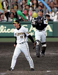 2007年5月20日(日) 対横浜 8回戦 甲子園 阪神1×0横浜4 所載はこちらをクリック ミスターゼロや中村泰!6回9K今季初先発初勝利、虎3連勝!今季初先発初勝利を飾った中村泰。三振の山を築き、マウンドに仁王立ちだ (セ・リーグ、阪神1-0横浜、8回戦、4勝4敗、20日、甲子園)ええやん、ヤッさん!! 阪神は左腕、中村泰広(28)が6回9奪三振の快投で今季初先発初勝利。KJFとの完封リレーで、3連勝に導いた。22日・ソフトバンク戦(ヤフーD)からの交流戦突入を前に、完封勝利した杉山に続く連続0封。虎投に光明や!◇ 思いを込めたスライダーが、ことごとくバットに空を切らせる。プロ入り3度目の先発マウンドで、中村泰が威圧感すら漂わせた。六回までに9奪三振。圧巻の奪三振劇場に聖地のボルテージは最高潮に達した。 「ここは何回でも立ちたい思わせてくれる場所です!!」 自身2度目となる本拠地のお立ち台で叫んだ。6回4安打無失点。昨年7月以来の先発マウンドももの怖じしなかった。まずは一回だ。先頭・仁志に中前打を浴びるも、そこから本領を発揮。続く石井琢、金城、村田を連続で空振り三振。伝家の宝刀スライダーでなぎ倒した。勢いは止まらない。三回も豪快にファンを沸かせた。仁志、石井琢を空振り三振させると、最後は金城を見逃し三振。横浜打線を完全に封じ込めた。 「1イニング、1イニング。3回でバテてもいいと思った」中村泰(右)は打のヒーロー林威助とお立ち台で笑顔 待ちこがれた舞台だった。秋季キャンプから「ポスト井川」争い。だが、小嶋、能見、江草らにおくれを取り、開幕は二軍スタート。4月20日に昇格を果たしたが、仕事場は中継ぎ。だが、9試合、13イニング連続無失点で先発を勝ち取った。 オフに奈良の実家へ帰った際、両親から「自分の出せる力以上のものは、絶対に出せないんだからね」と諭された。先発ローテ入りしたい-その気負いを見抜かれたかのようなメッセージ。肩の力が抜けた瞬間だった。 その教えが、マウンドで活きている。まな弟子の活躍をチェックしている奈良・郡山高時代の森本達幸監督は「投げ急がず、落ち着き払っている」と話す。昇格後、電話で中村泰は「もうプロに入って5年もたつんですよ」と笑ったという。 久保チーフバッテリーコーチは「今後も頭(先発)のラインアップには入ってくる」と太鼓判。岡田監督も「若い投手が頑張れば、次投げる投手の刺激になる。ベテランも頑張らんとな」と絶賛した。 「毎試合でアピールしていかないといけない立場ですから」 ジャン、同期の杉山に続き、先発が3試合連続で無失点。今季3度目のカード3連勝で借金は「3」。過去2年、たっぷり貯金を稼いだ交流戦へ。逆襲の虎の牙は磨き上がった。林でっかいでっかいタイムリー!“鬼指令”にもフルスイング!四回裏一死一、三塁で右前へ運んだ林威助。“虎の子”の1点を叩きこんだ (セ・リーグ、阪神1-0横浜、8回戦、4勝4敗、20日、甲子園)この肝の座ったスイングが林の専売特許だ。0-0で迎えた四回一死一、三塁。打席に向かう背番号31に、正田コーチの“鬼指令”が飛んだ。 「三振だけは、したらアカンぞ!」 相手は内野が下がり、1点覚悟の守備隊形。転がせば1点だが…言うは易し。しかもマウンドには2日前に打ち取られたサイド左腕・山北だ。 「とにかく三振だけはしないように。それだけを考えていました」 0-2から、外角低めの難しい変化球が2つ決まり、2-2。追い込まれた。「バットに当てよう…」。しかし5球目、甘く入った126キロスライダーを振り抜いた鋭さは、とても当てにいったものではない。快音を残した打球がアッと言う間に一、二塁間を破る。3連勝に導く虎の子の1点は、けれんみのないスイングから生まれた。 「甘い球でしたからね。ラッキーです」 涼しげに振り返ったが、瞬時に体が反応した見事な『左腕』+『変化球』打ち。六回も、左腕・那須野のスライダーをライナーで右前へ運んだ。これで今季対右投手の打率が.372に対し、左投手でも.303。左投手の時はベンチに下げられ、変化球で打ち取られたのはもう過去の話だ。 今春のキャンプで、広沢コーチが林の成長として挙げていたのが“間”の取り方。球に対して一瞬、体が止まれる感覚だ。開幕直後こそ浜中にスタメンを譲ったが、ライバルの離脱後、試合を重ねるごとに飛躍的に対応力はアップ。 「やはり経験ですね。球の曲がり方とか、打席に立ってみないとわからないですし」。21日に浜中が一軍合流するが、もう争う立場ではない。不動の座を、姿と結果で築いた。 二回には右前打を後逸するまずい守備(三塁打)も、「バットでいいアピールしないと」と反発力も見せての、12試合連続安打。同級生・中村泰とのお立ち台では「ヤッさんナイスピッチング!」「リンさんナイスバッティング!」と声をかけ合った。はや28歳、柱となる時期。パの強敵に挑む交流戦へ向け、虎の新時代を感じさせるツーショットだった。3回無失点『KJF』安心リレーで球児12S!さあ次は交流戦!七回からリ